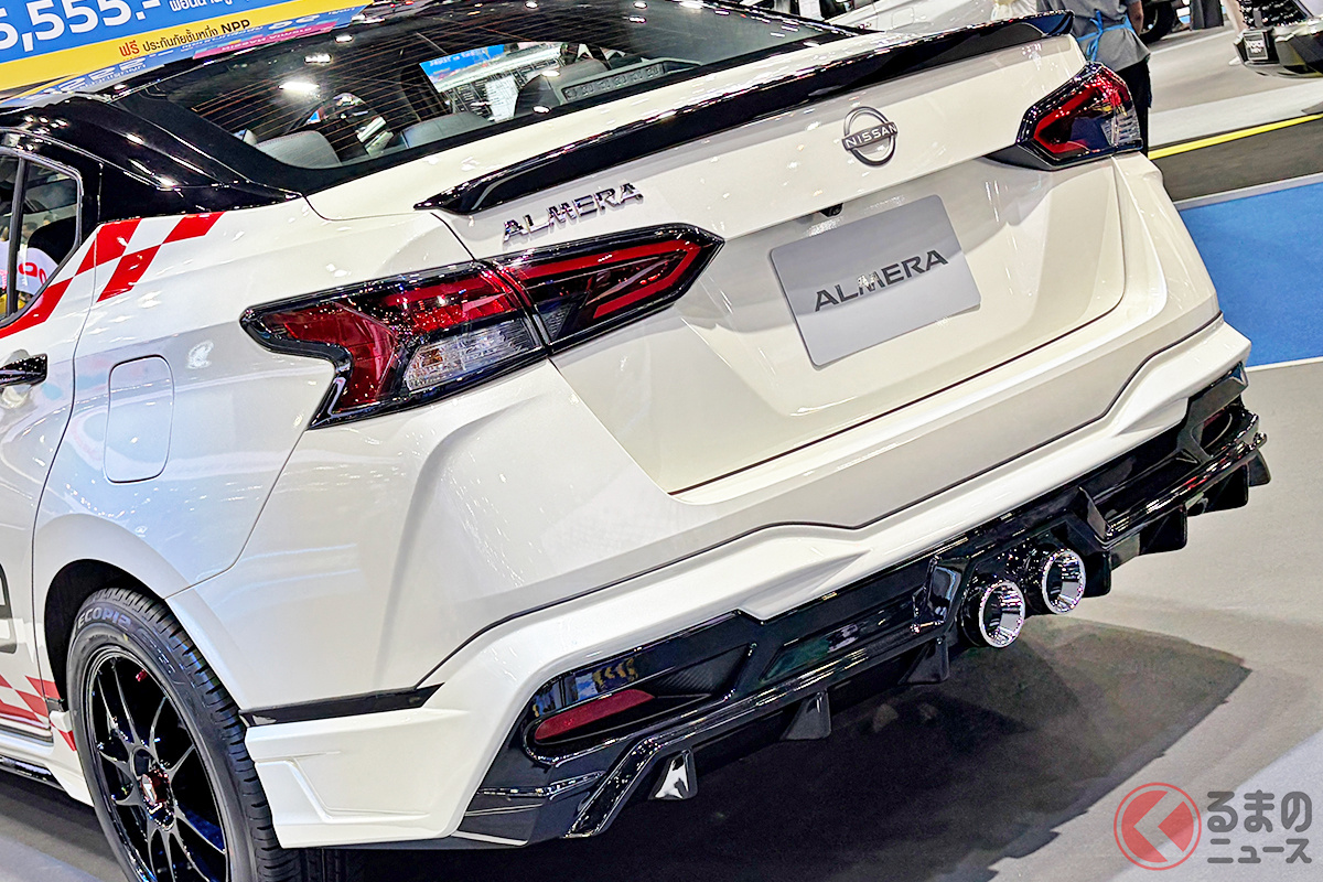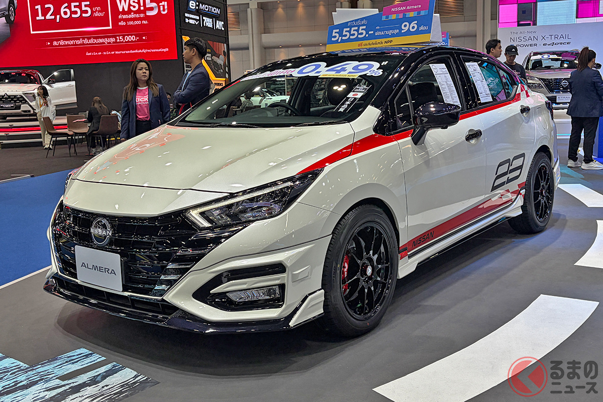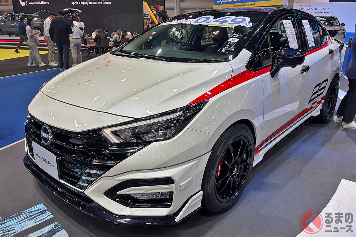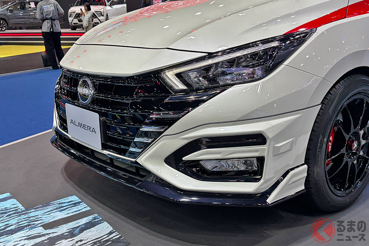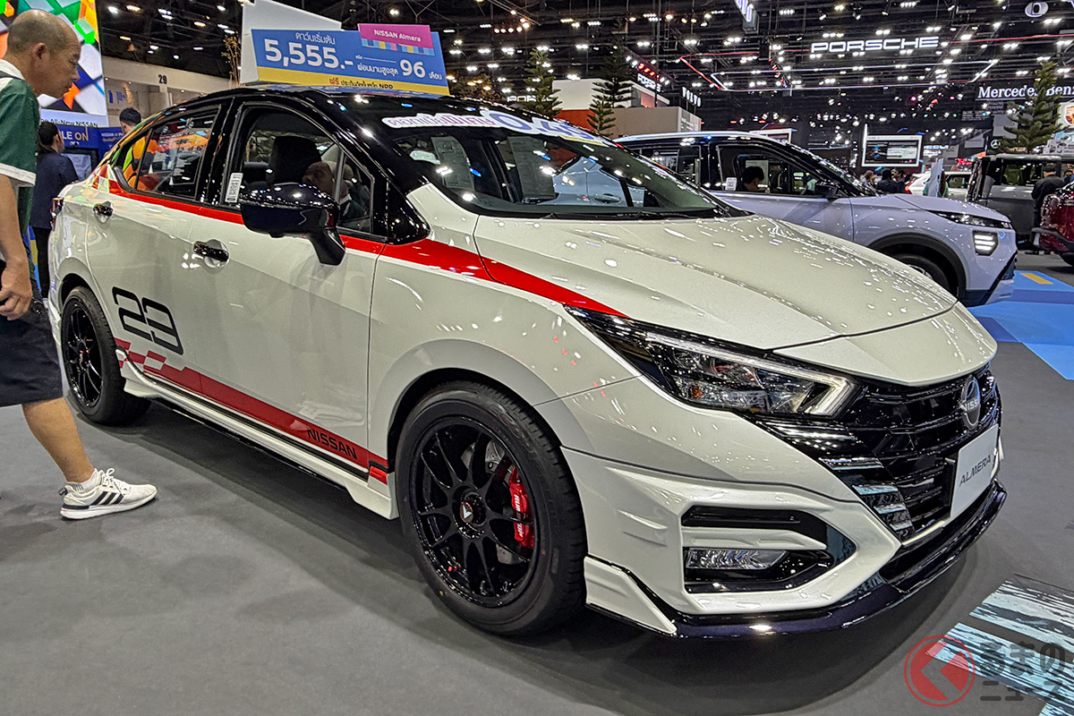 日産「アルメーラ」は、東南アジア市場で展開されているコンパクトセダンです。1リッターターボの実用モデルですが、「バンコクモーターショー2026」では、エアロパーツなどで大胆にカスタマイズされたモデルが出展され注目を集めていました。