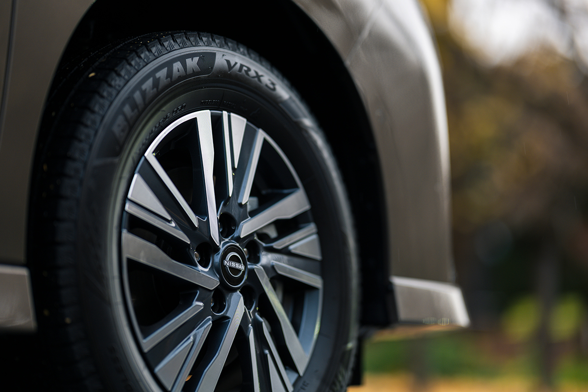 足元にはブリヂストンのスタッドレスタイヤ「BLIZZAK VRX3」を装着 ※通常は夏タイヤが装備されます