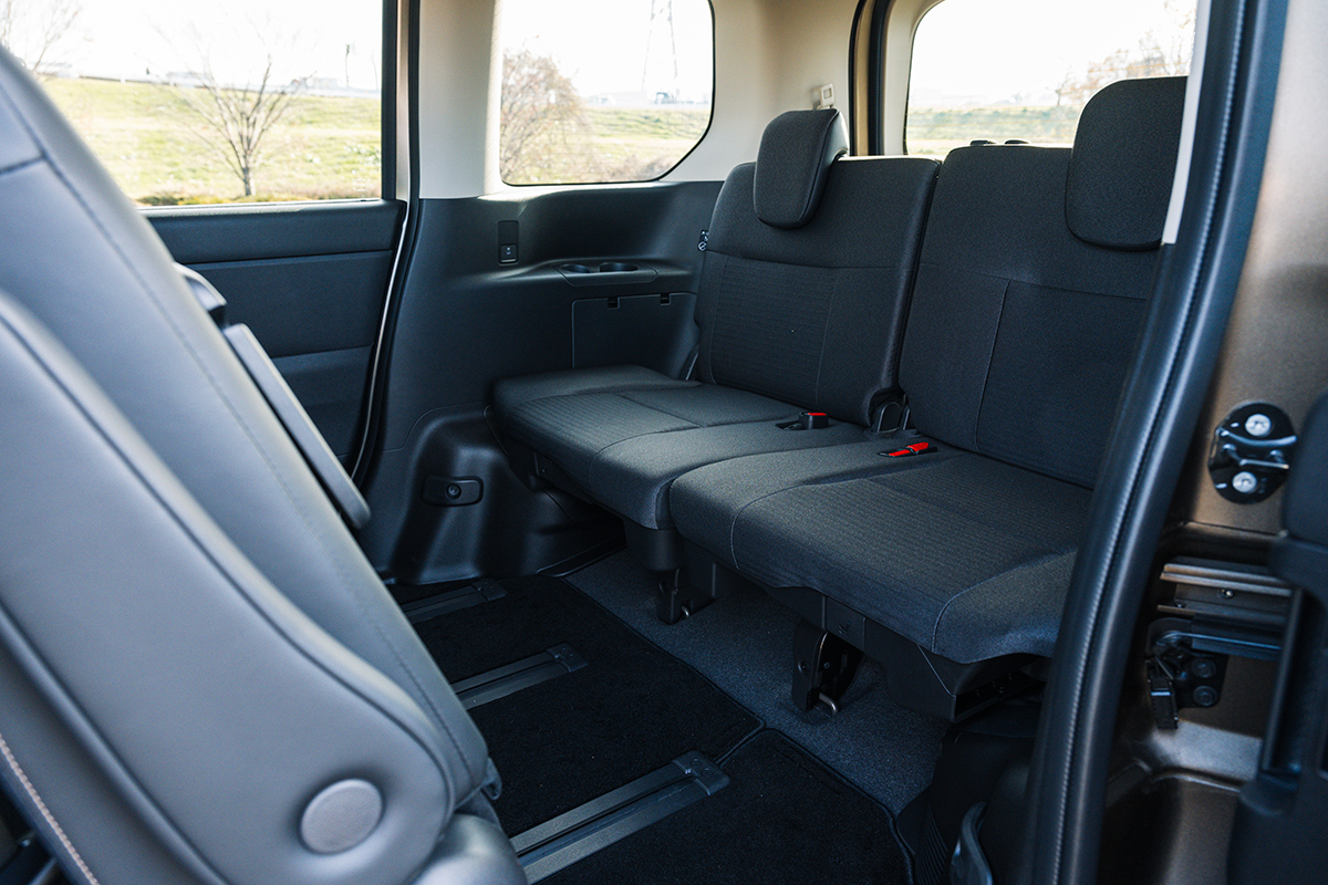 1列目から3列目まで、すべての席がゆったり座れるセレナ。2列目シートをロングスライドさせると、大人でも脚を伸ばせるほど広々とした空間に。さらに、横スライドをさせればスライド量最大640mmの超ロングスライドが可能になる