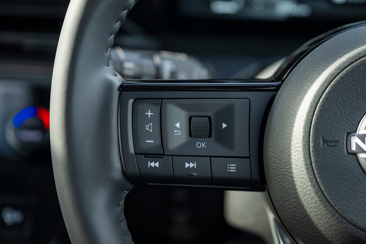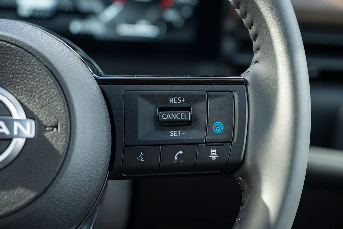 高速道路の運転で、クルマの車速や車線の維持をしてくれる日産の運転支援技術「プロパイロット」。ステアリングの青いボタンを押すと起動する