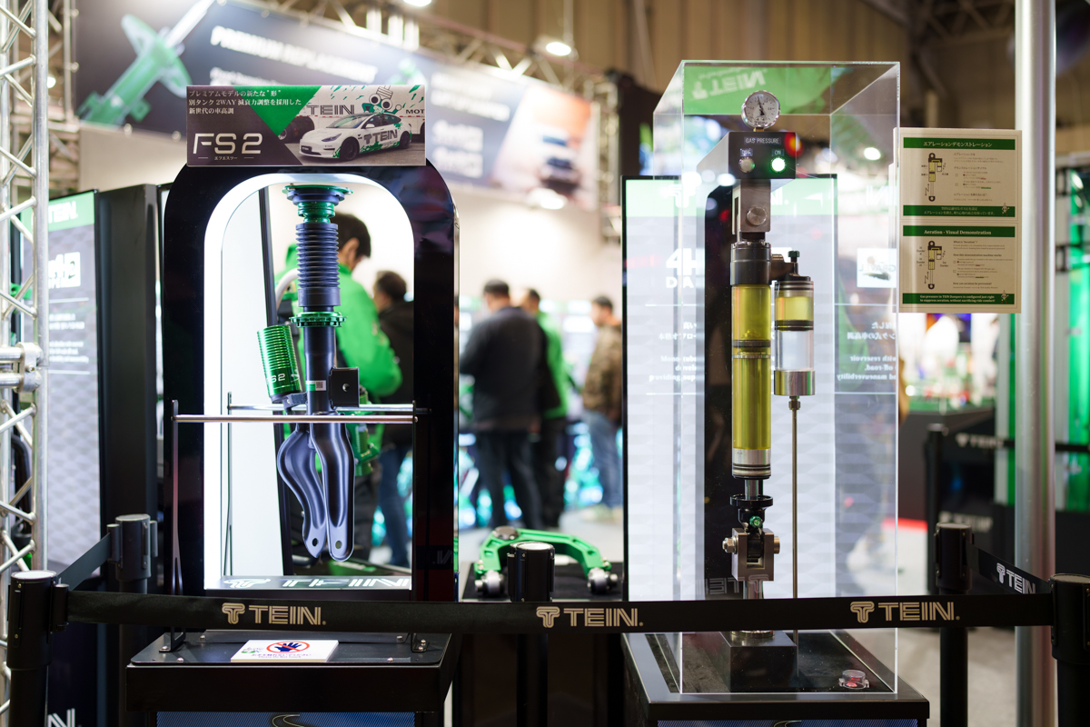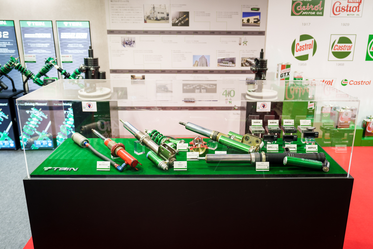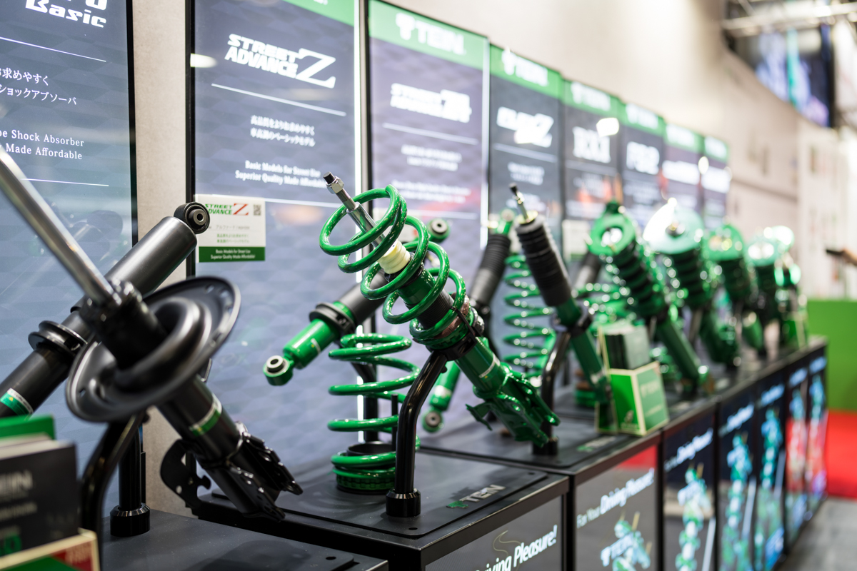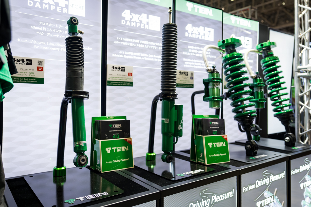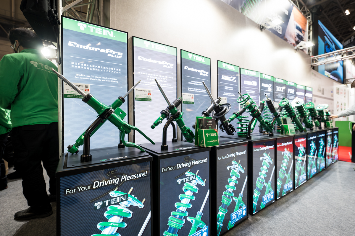 東京オートサロン2025のテインブースに展示された、同社製サスペンションの数々