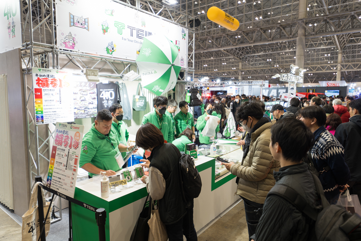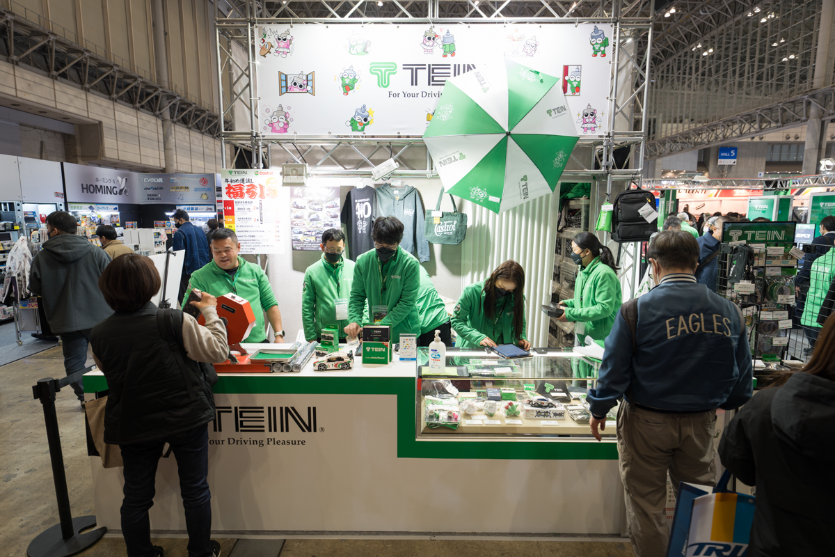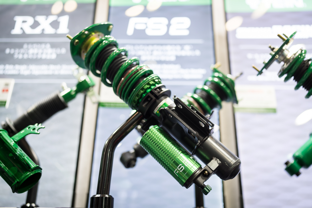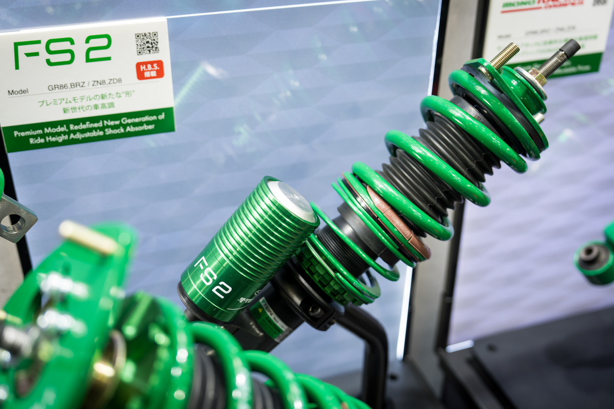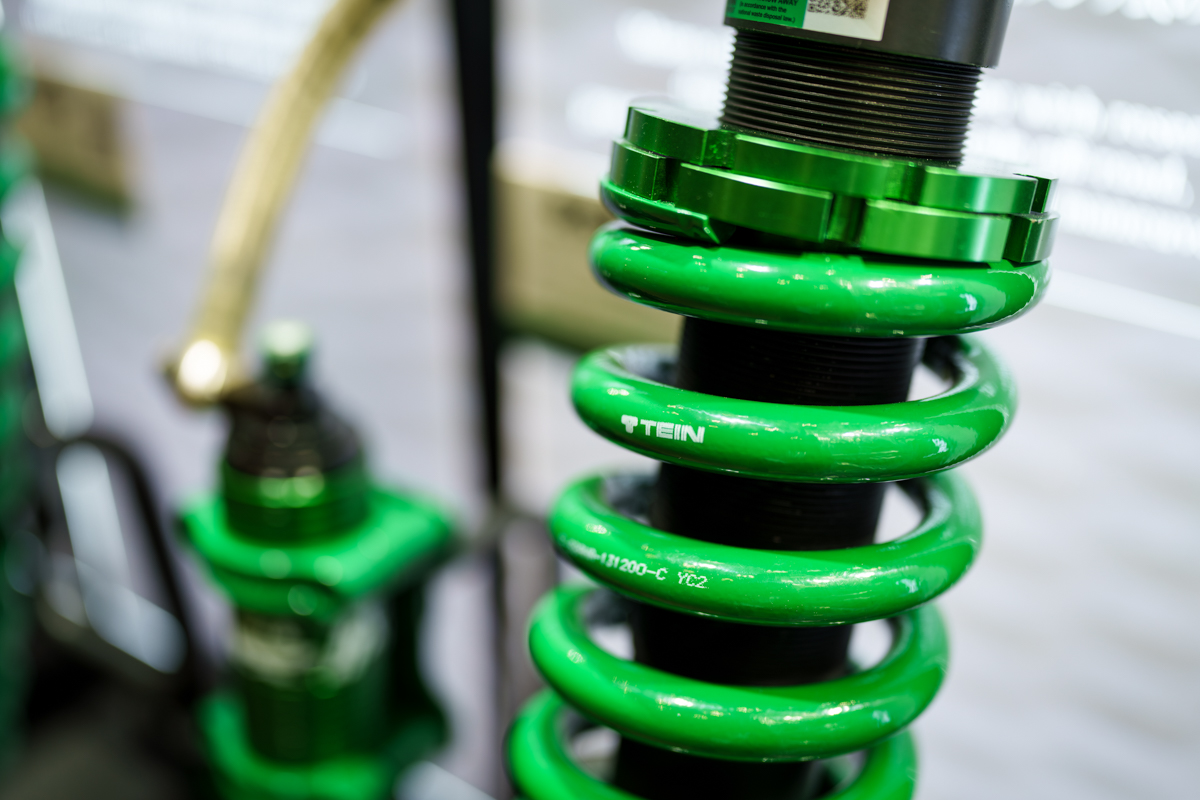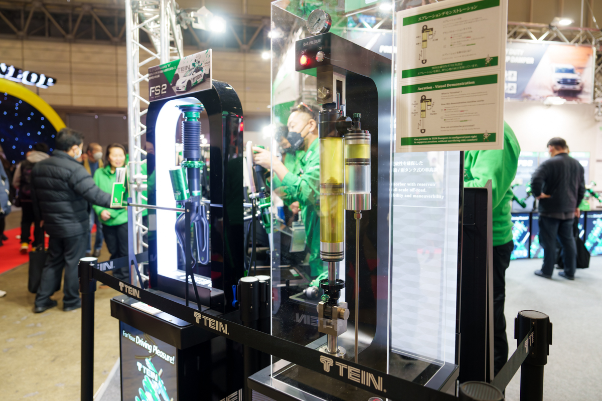 東京オートサロン2025のテインブースに展示された、同社製サスペンションの数々