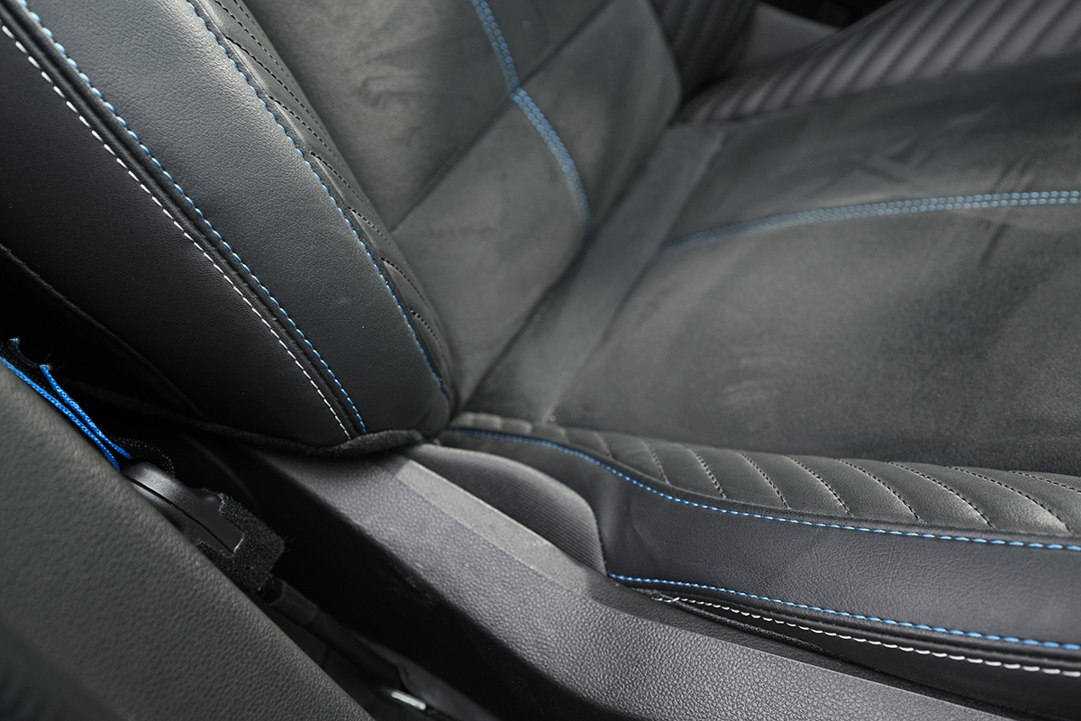 ブルーのステッチやアルピーヌの刺しゅうロゴが目を引くフロントシート