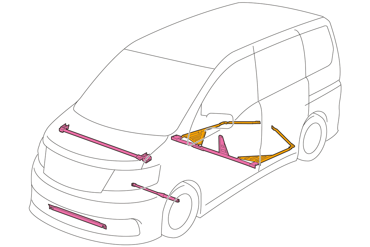 「C25 セレナ ライダー ハイパフォーマンス スペック/パフォーマンス スペック」は、YAMAHAパフォーマンスダンパーや各所に補強バーを採用。まさにセレナ AUTECH SPORTS SPECの前身モデルとも言える