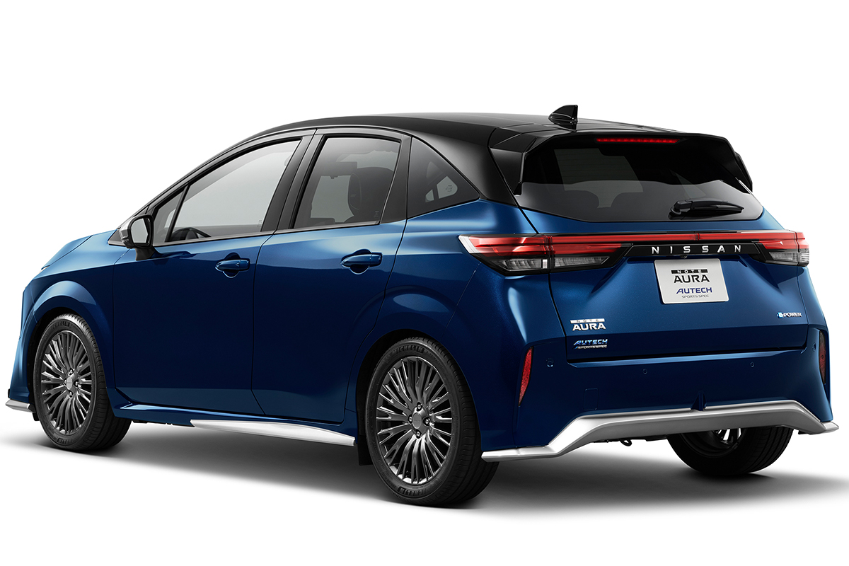 こちらは「オーラ AUTECH SPORTS SPEC」。ダウンフォース向上に貢献する 大型のルーフスポイラーと、20mm下がった車高が、スポーティな印象を強調する