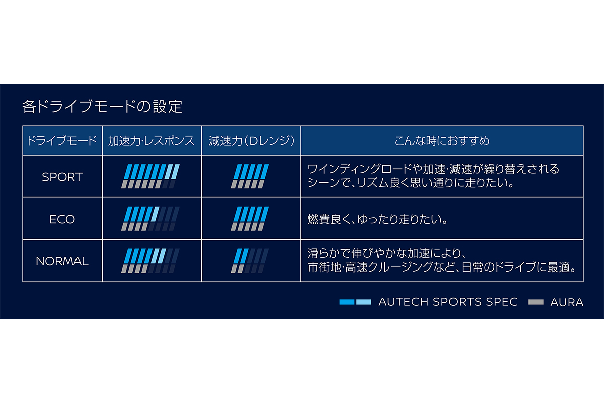 「オーラ AUTECH SPORTS SPEC」と通常モデル「オーラ」との各ドライブモードの設定を比較したイメージ