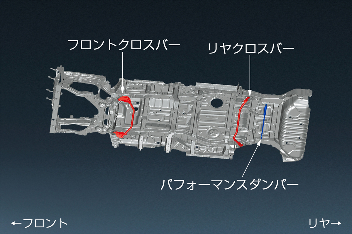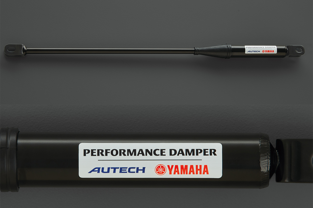 車体下部の前後のクロスバーと併せて、後ろ側に装着される「YAMAHAパフォーマンスダンパー」は、走行中の車体の変化や不快なノイズ、振動を効果的に吸収する技術を用いたダンパー。車体の微小な変化や振動を抑え、減衰させることで、操作性や快適性の向上に大きく寄与する
