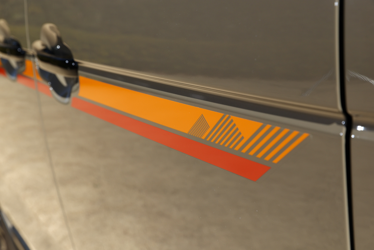 サイドデカールの後方端のデザインは、ボディの左側は山、右側は波をモチーフとし、左右非対称のデザインを取り入れている