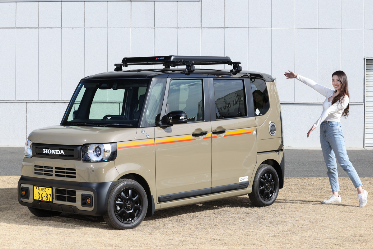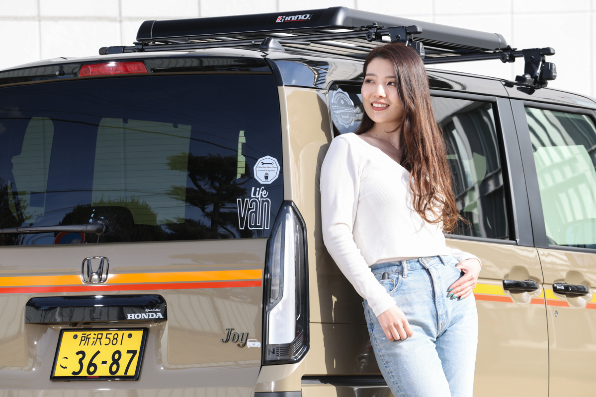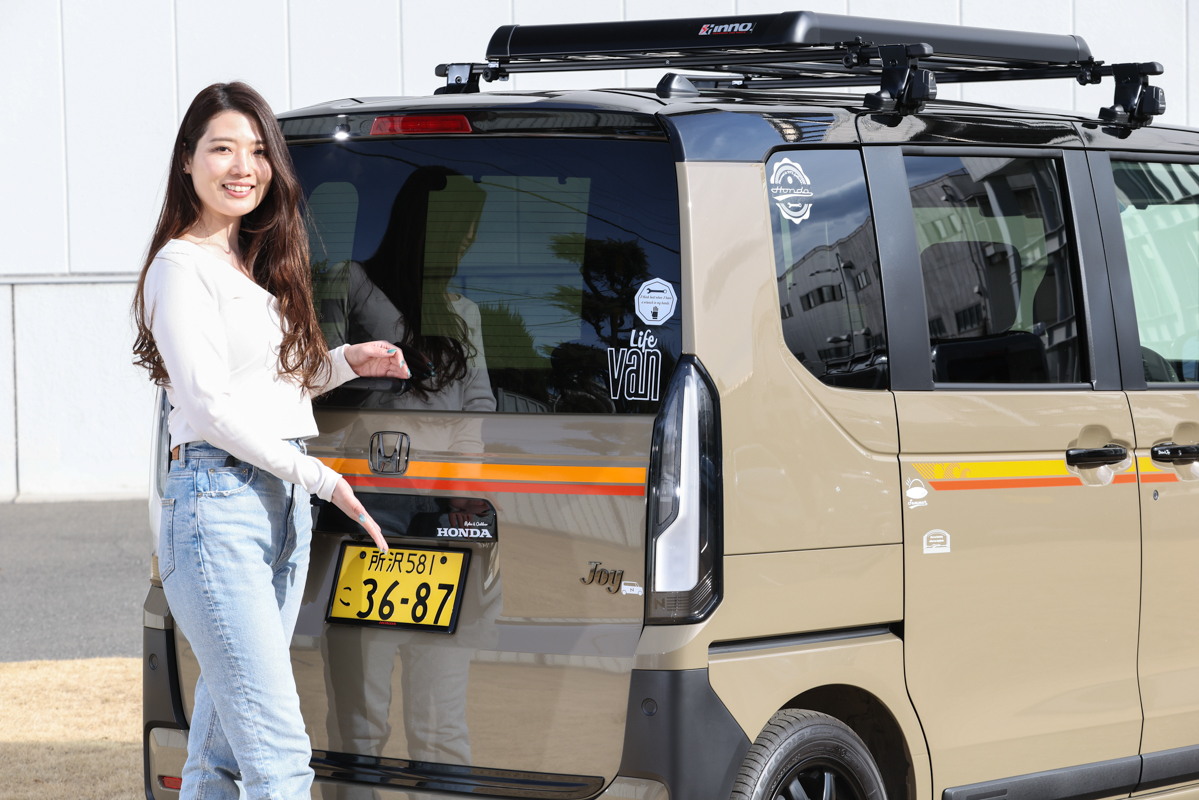 筆者の黒木美珠がデカールセットを貼った、純正アクセサリーを装着した「N-BOX JOY」