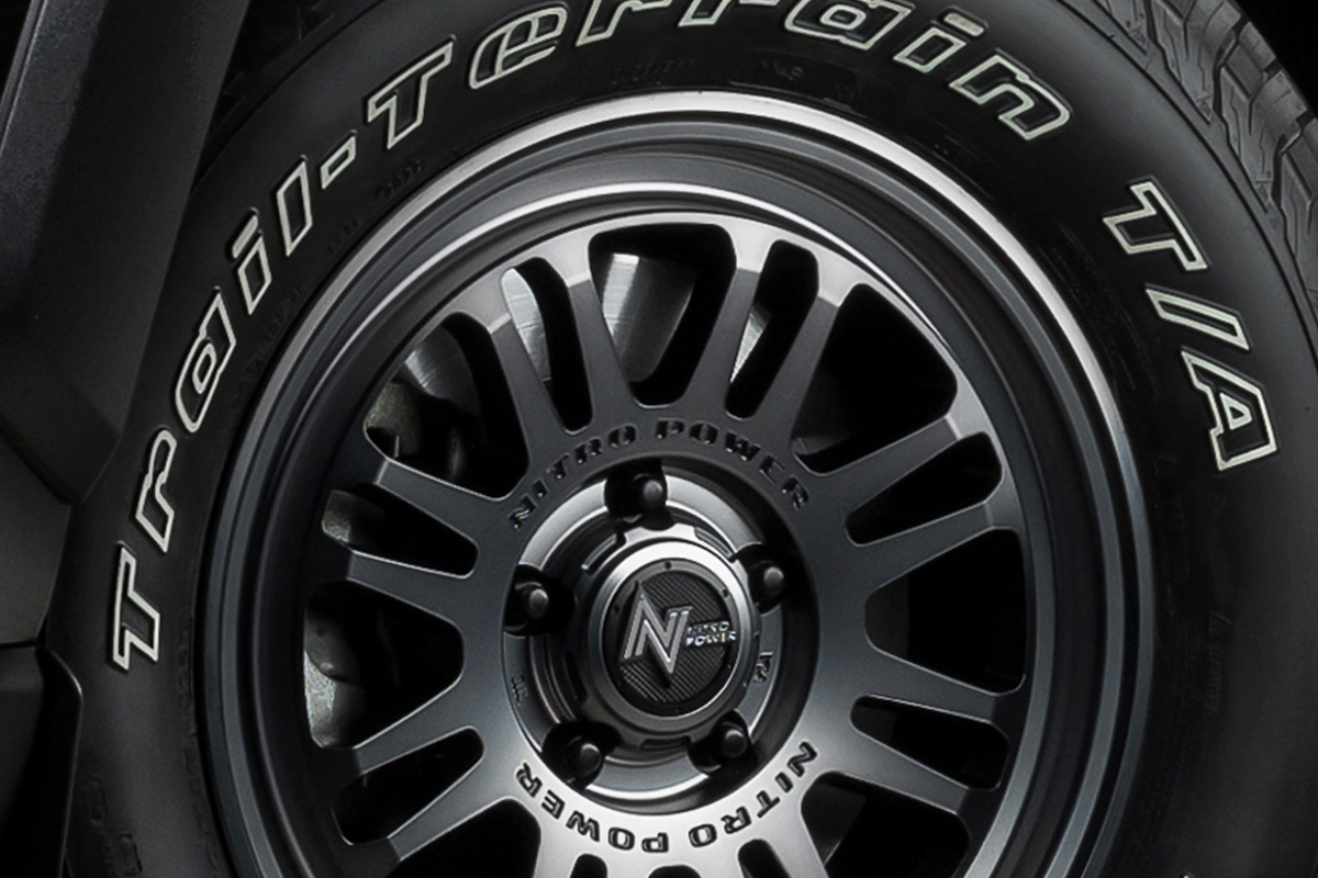 力強く刻まれたNITRO POWERの文字。5穴-PCD139.7サイズ以外はセンターキャップも標準で付属する