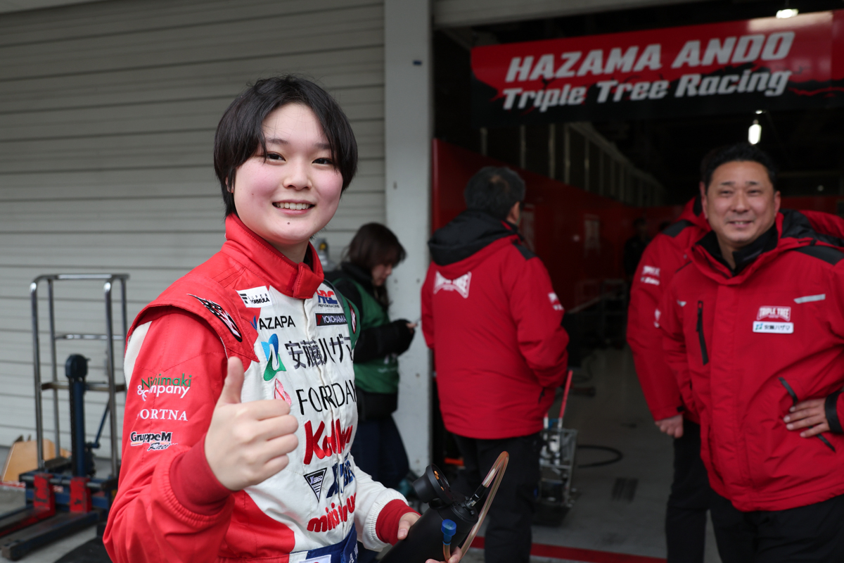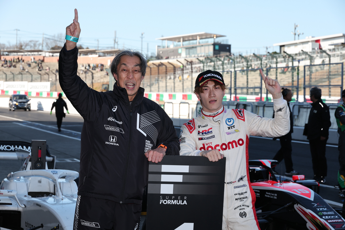 2025 スーパーフォーミュラ第2戦の決勝1位を飾った牧野任祐(DOCOMO TEAM DANDELION RACING)選手と、DOCOMO TEAM DANDELION RACINGチーム代表の村岡潔氏