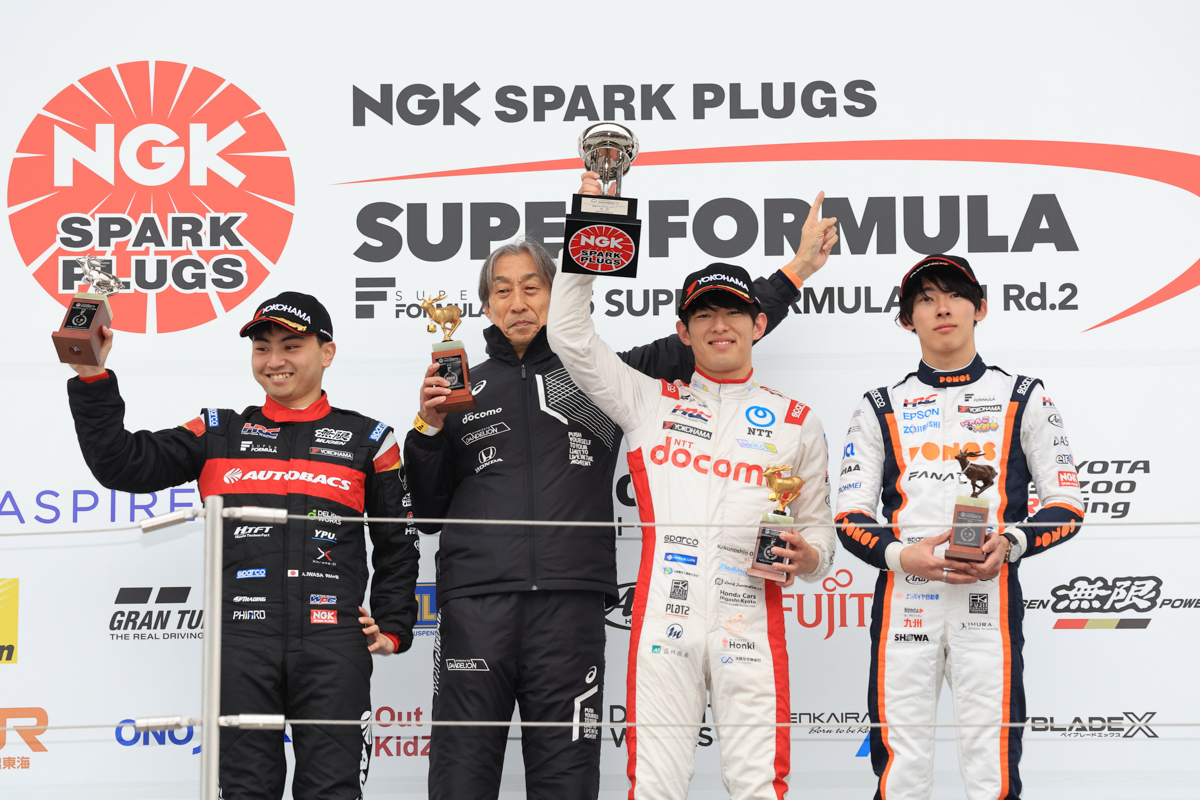 左から、第2戦決勝 2位の坪井翔(VANTELIN TEAM TOM’S)選手、DOCOMO TEAM DANDELION RACINGチーム代表の村岡潔氏、第2戦決勝1位の牧野任祐(DOCOMO TEAM DANDELION RACING)選手、第2戦決勝3位の岩佐歩夢(AUTOBACS MUGEN)選手