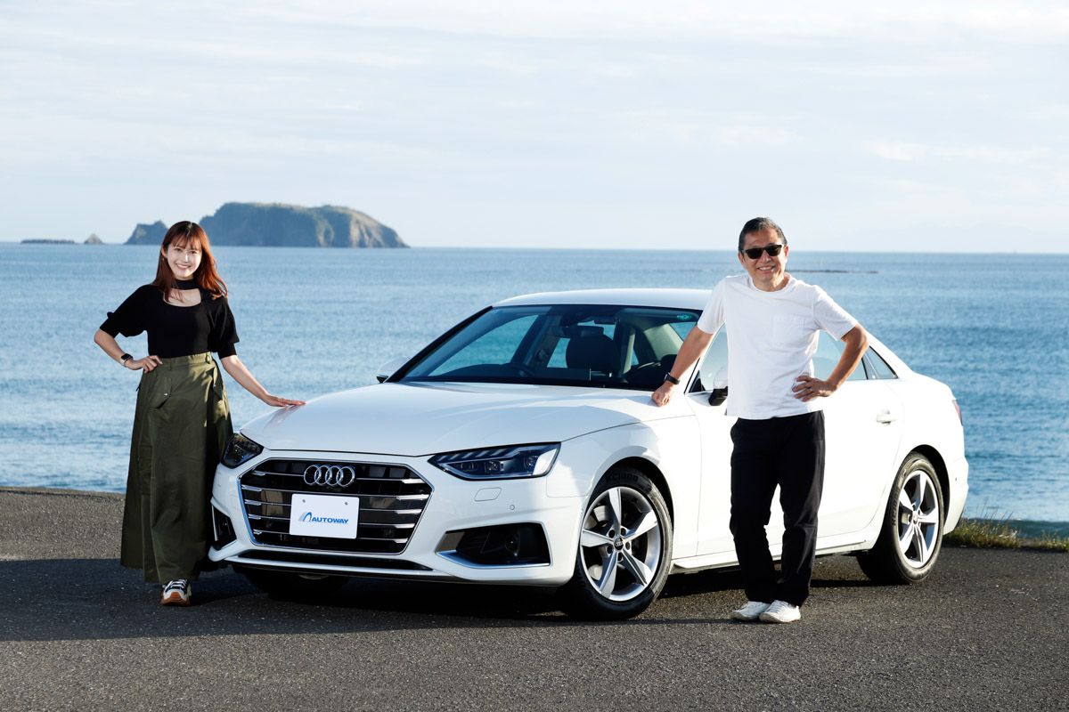 アウディA4を前にほほ笑む筆者の大谷達也さん(左)とモデルかつ、カメラマンの肩書も持つ後藤佑紀さん(右)