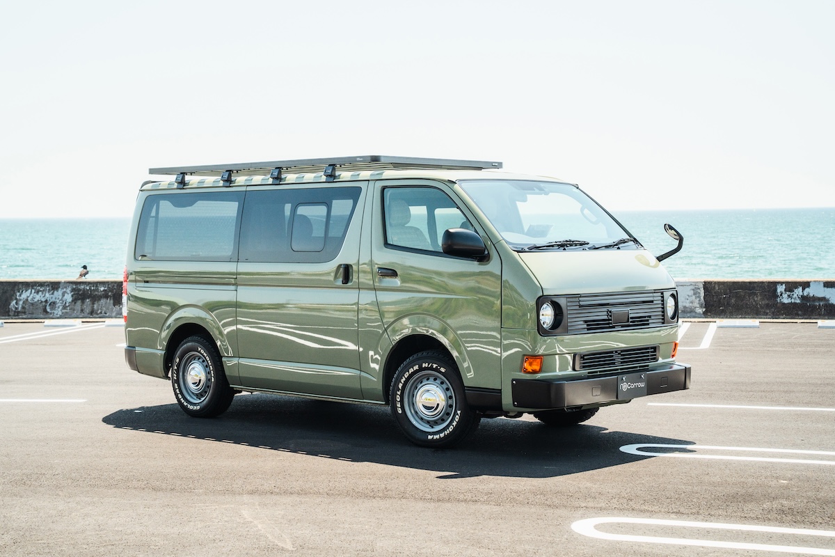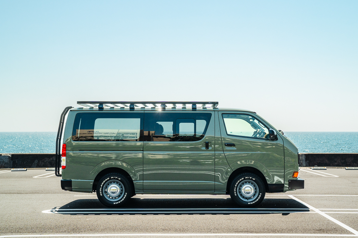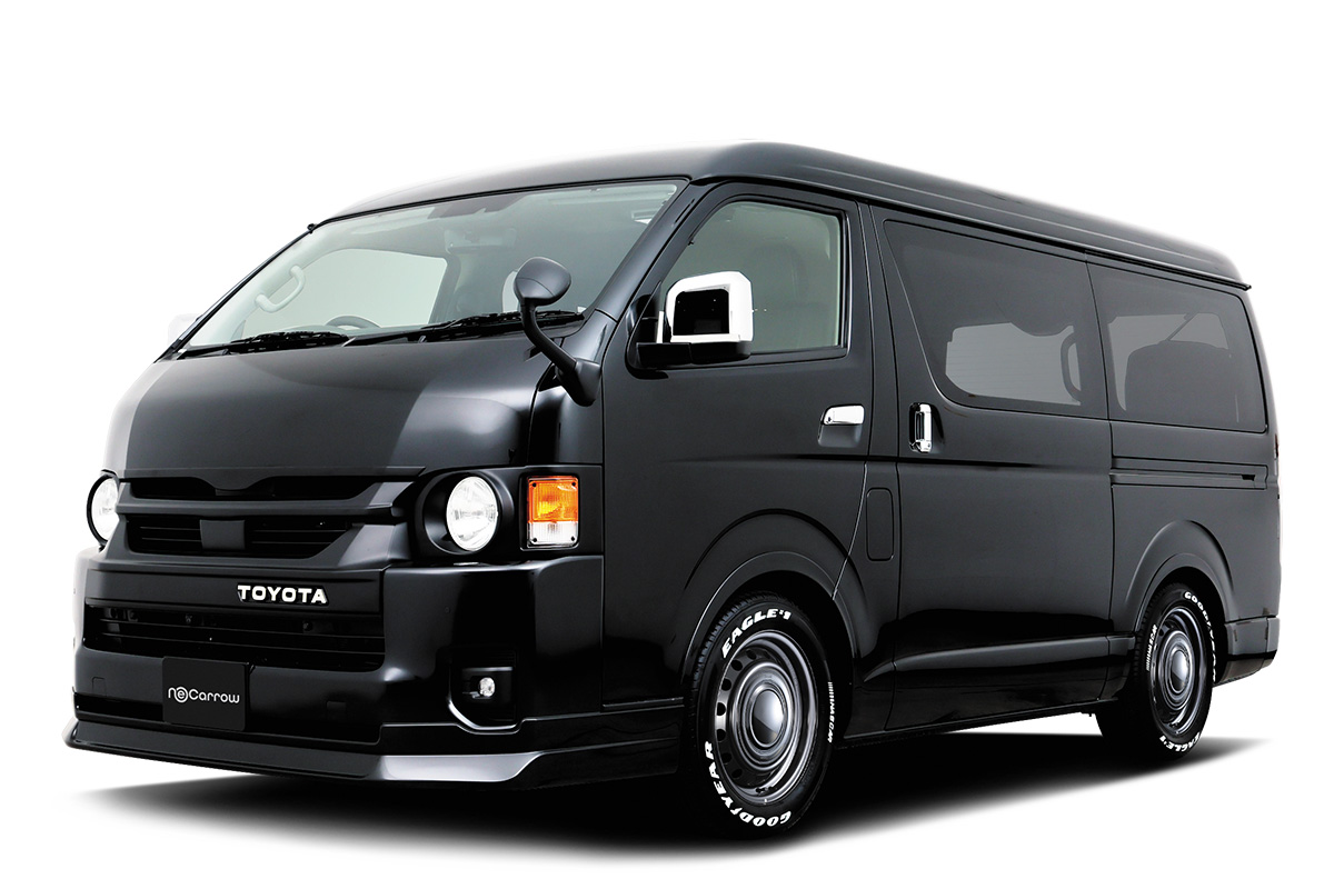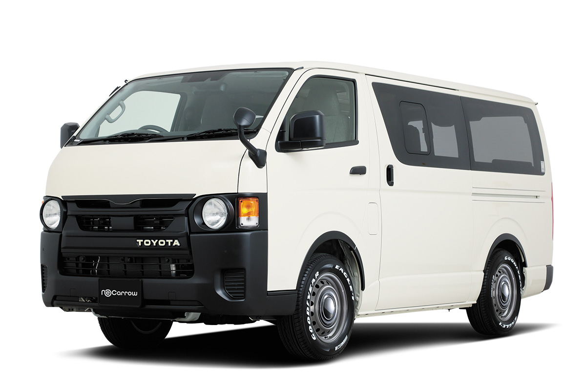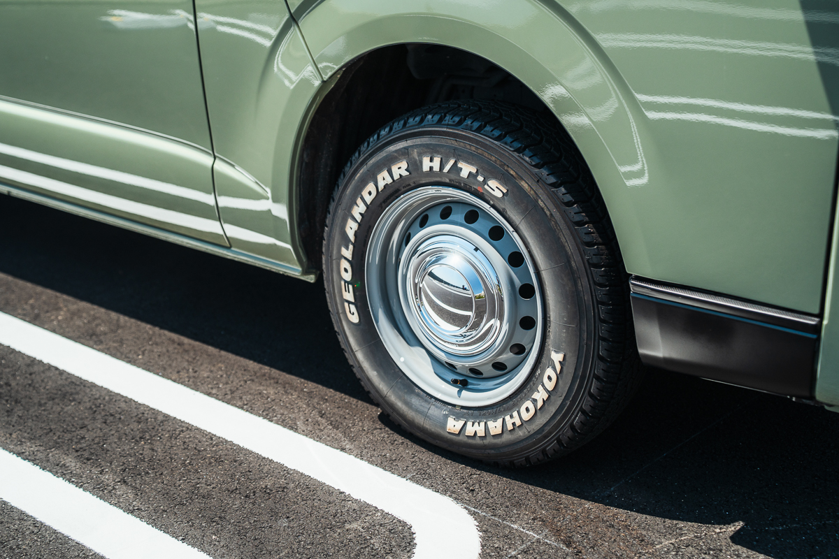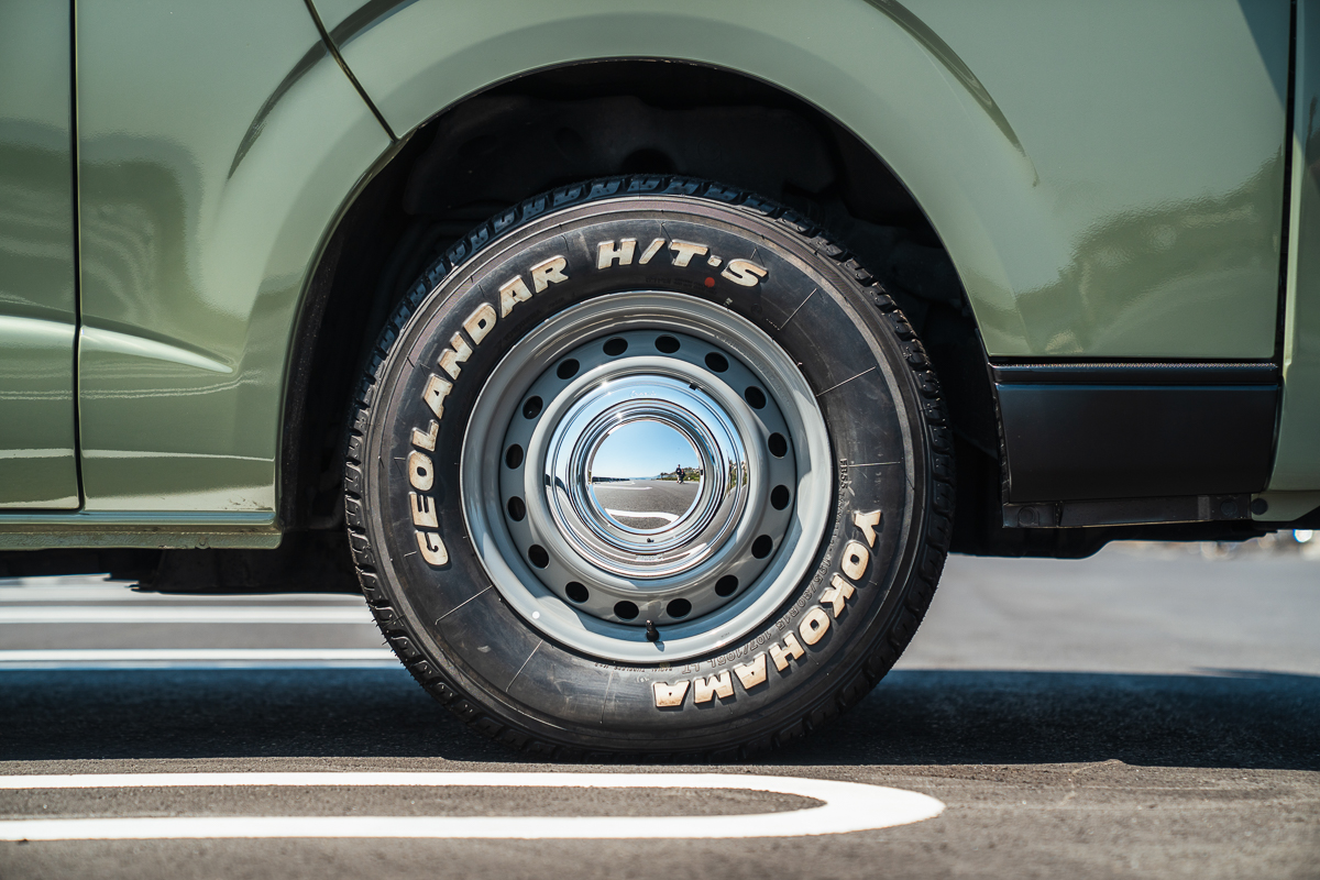 オートモーティブジャパンがカスタマイズしたトヨタ・ハイエースバン ナローに、ネオキャロのグレー×クロームキャップを取り付けた状態