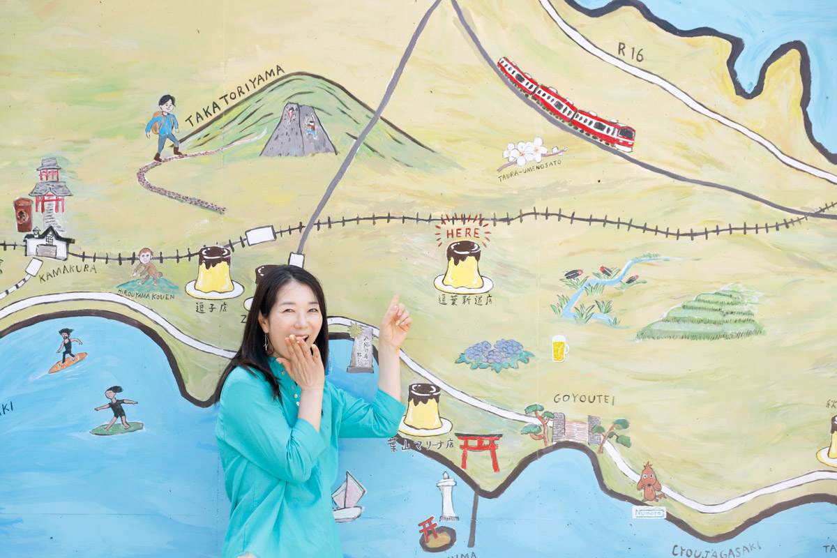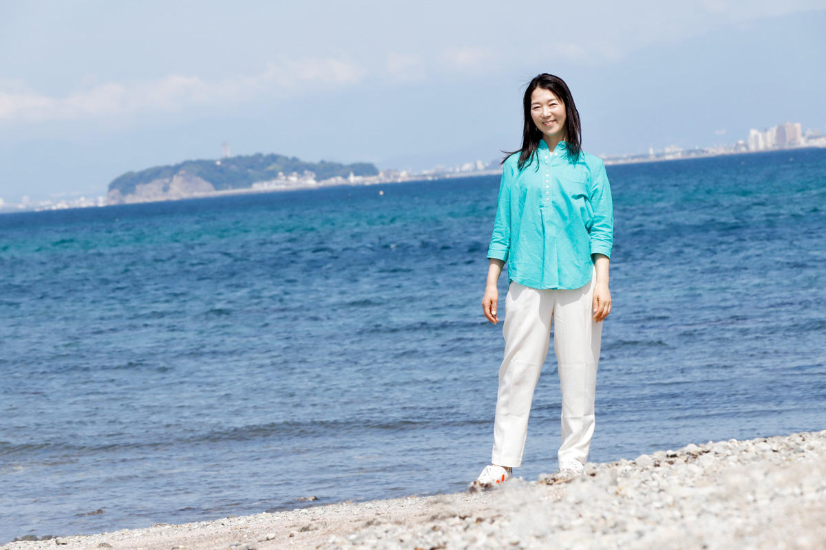 海岸沿いでほほ笑む筆者(まるも亜希子)