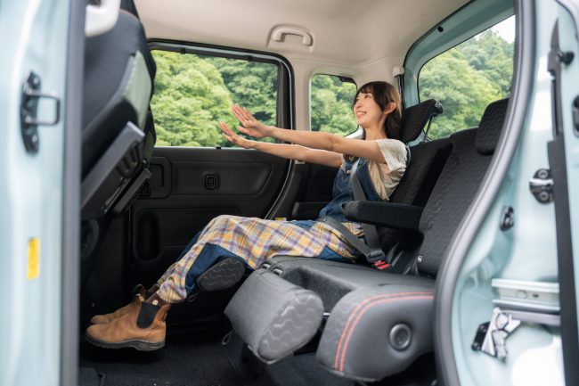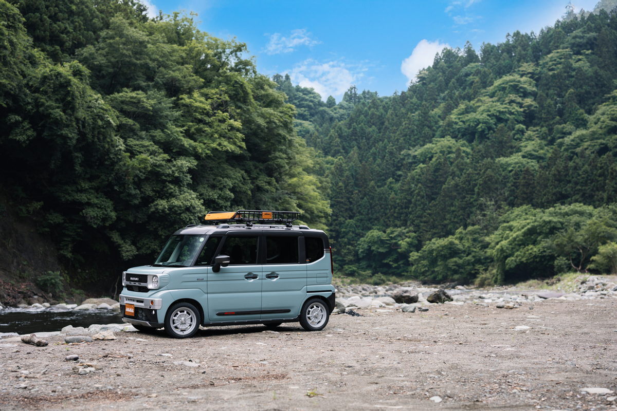 広い室内空間とアクティブなスタイルを融合したスズキの軽ハイトワゴン「スペーシアギア」。ラゲッジフロアやシートに防汚素材を採用することで、アウトドアアクティビティーの使い勝手も抜群