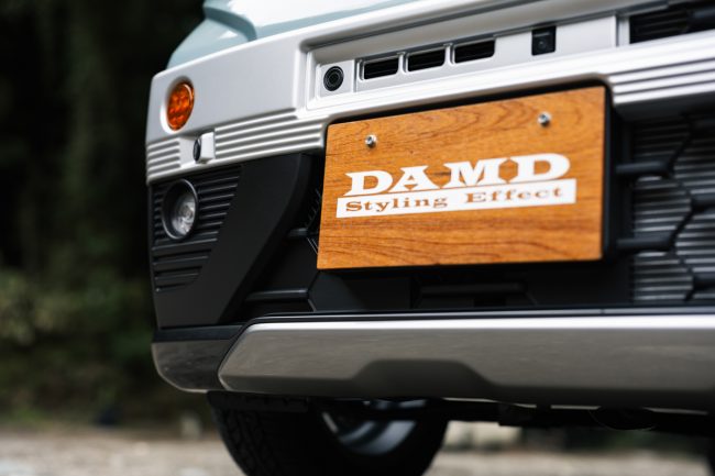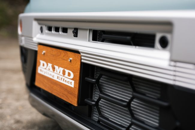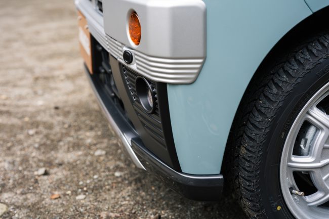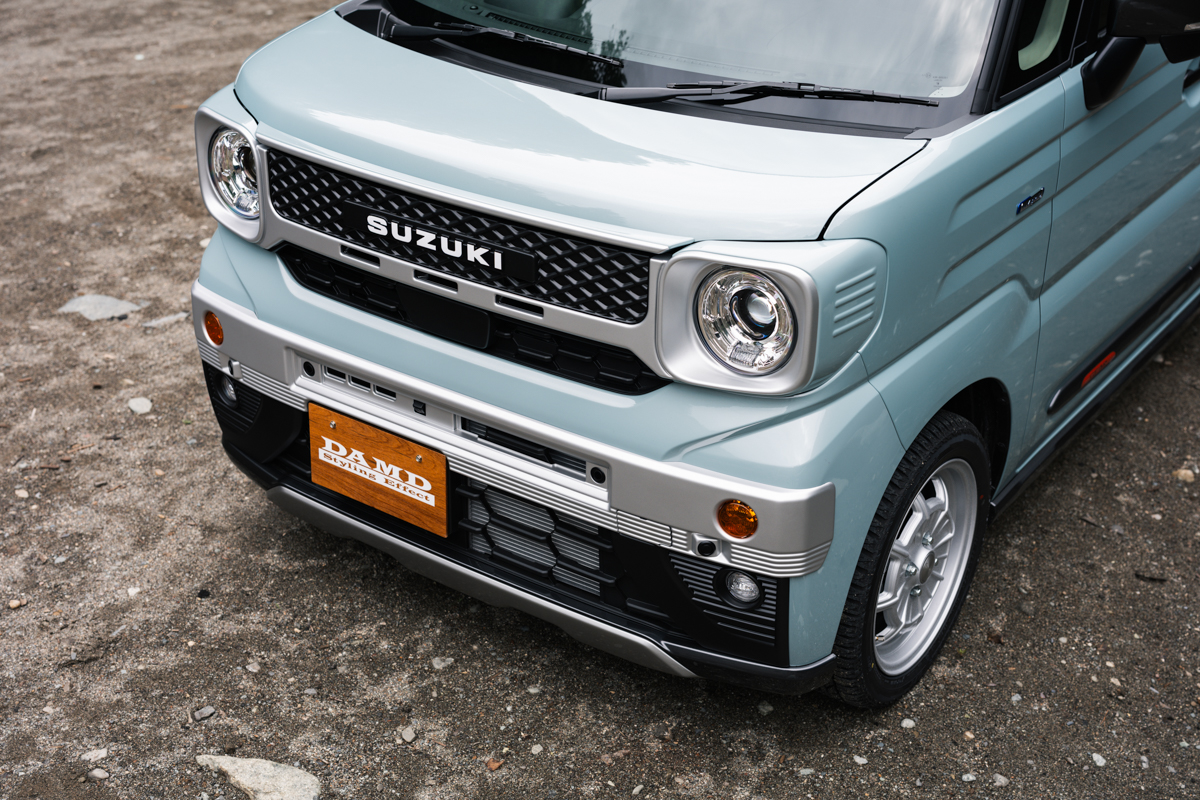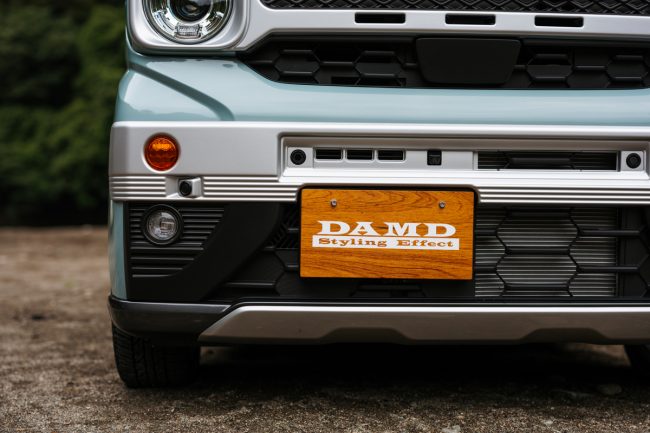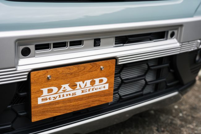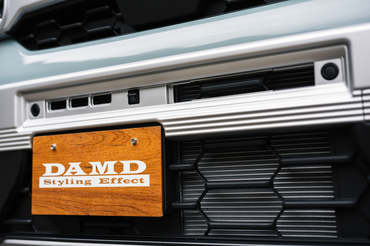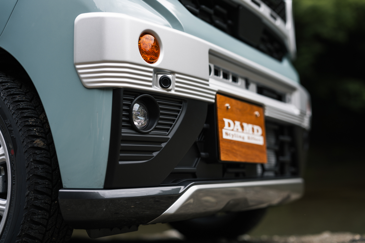 もちろん軽自動車サイズ内に余裕で収まる寸法で仕上げられた「フロントバンパーガーニッシュ」。レーダーなどの安全装備は純正と同じ位置に設置されるという気配りもダムドらしさ