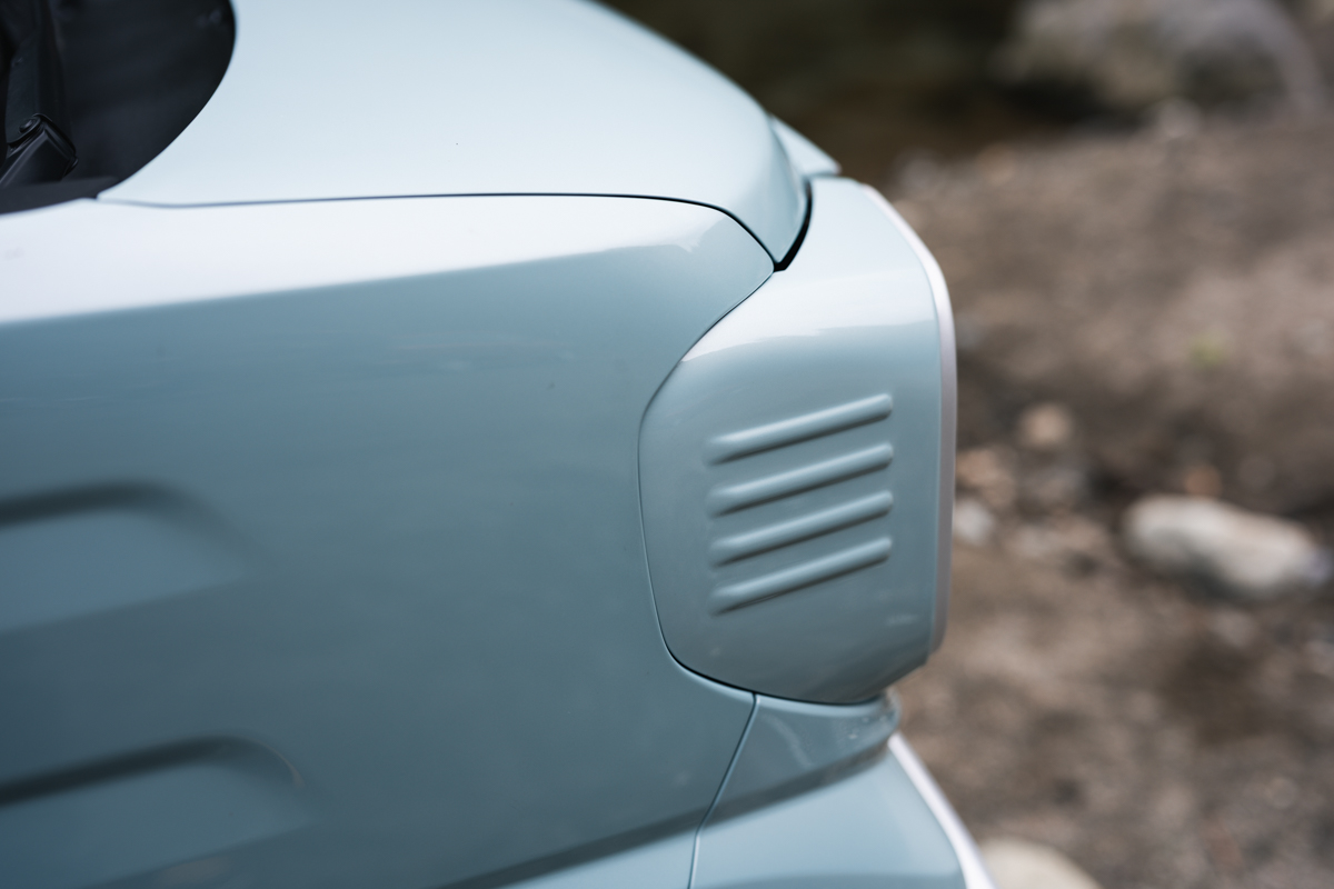 「フロントグリル」はスペーシアギアのアイデンティティーともいえる両側のヘッドライトを縁取るリングを上手にデザインに生かしている