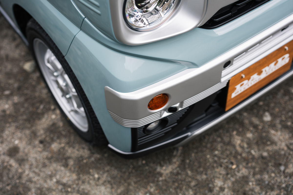 「フロントバンパーガーニッシュ」は驚くことに、スペーシアギアの純正バンパーを生かした“かぶせタイプ”のパーツなのだ