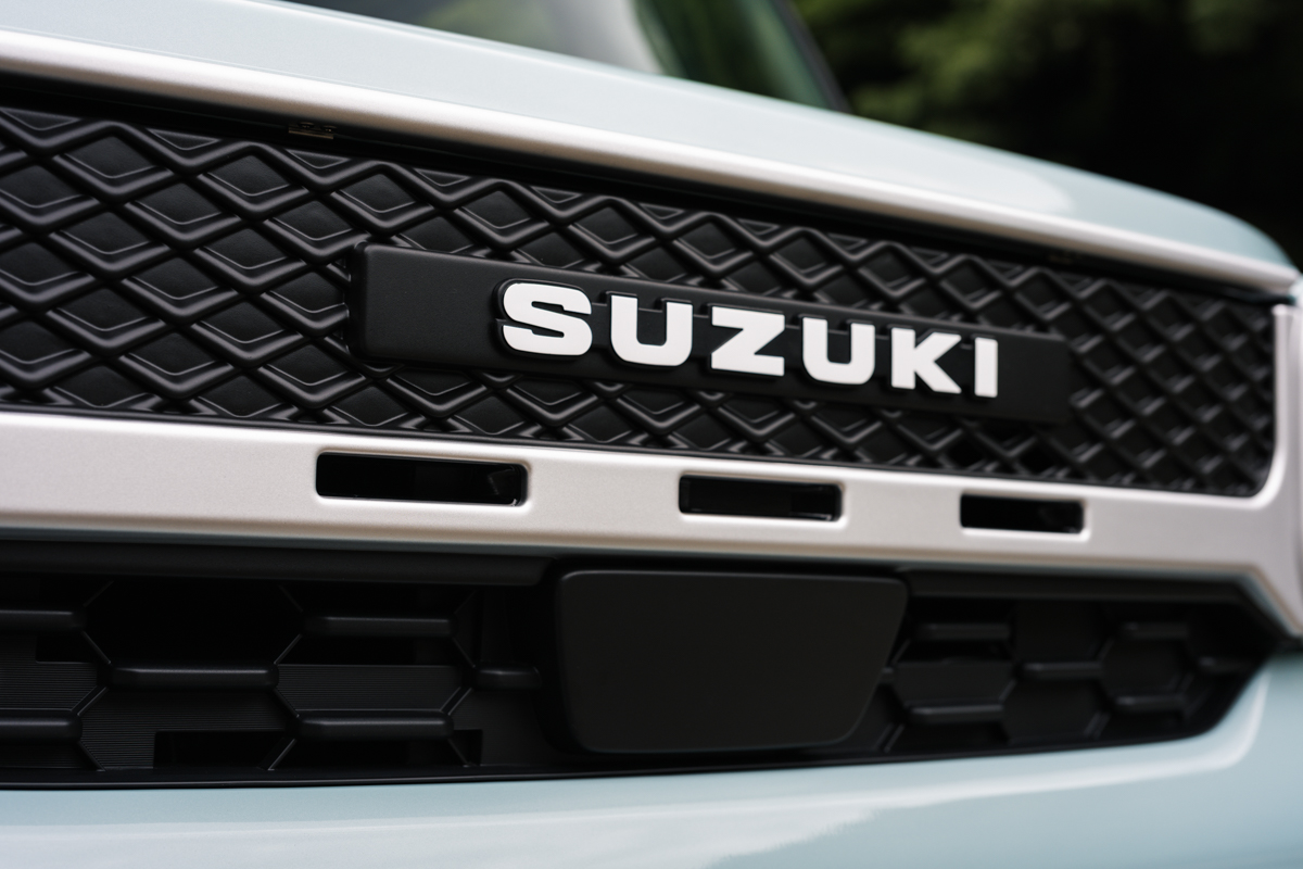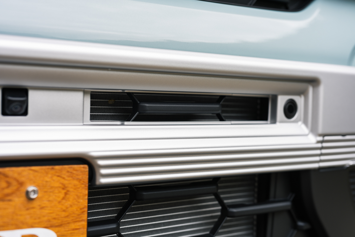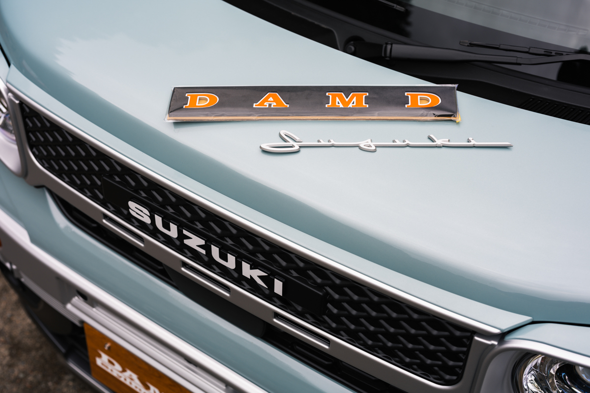「ユーザーらしいカスタムができるよう、あえて余白を残す」ダムドの哲学を感じさせる「フロントグリル」のエンブレム台座。オプションで用意される「SUZUKI」筆記体ロゴなど、好みのエンブレムが装着できるサイズ設定になっている
