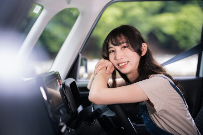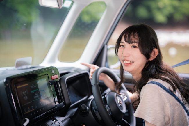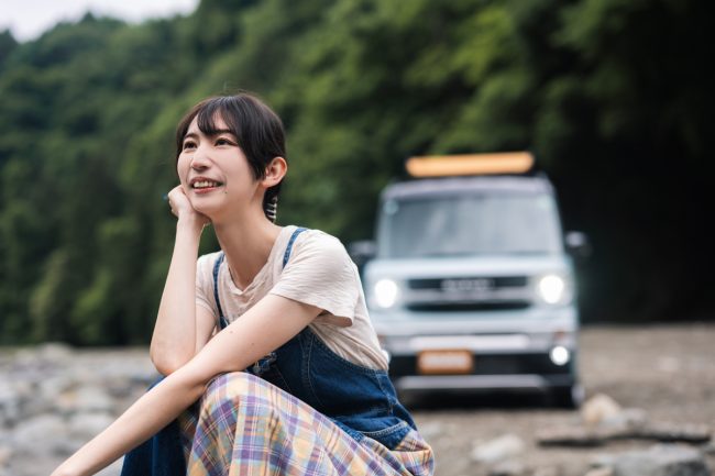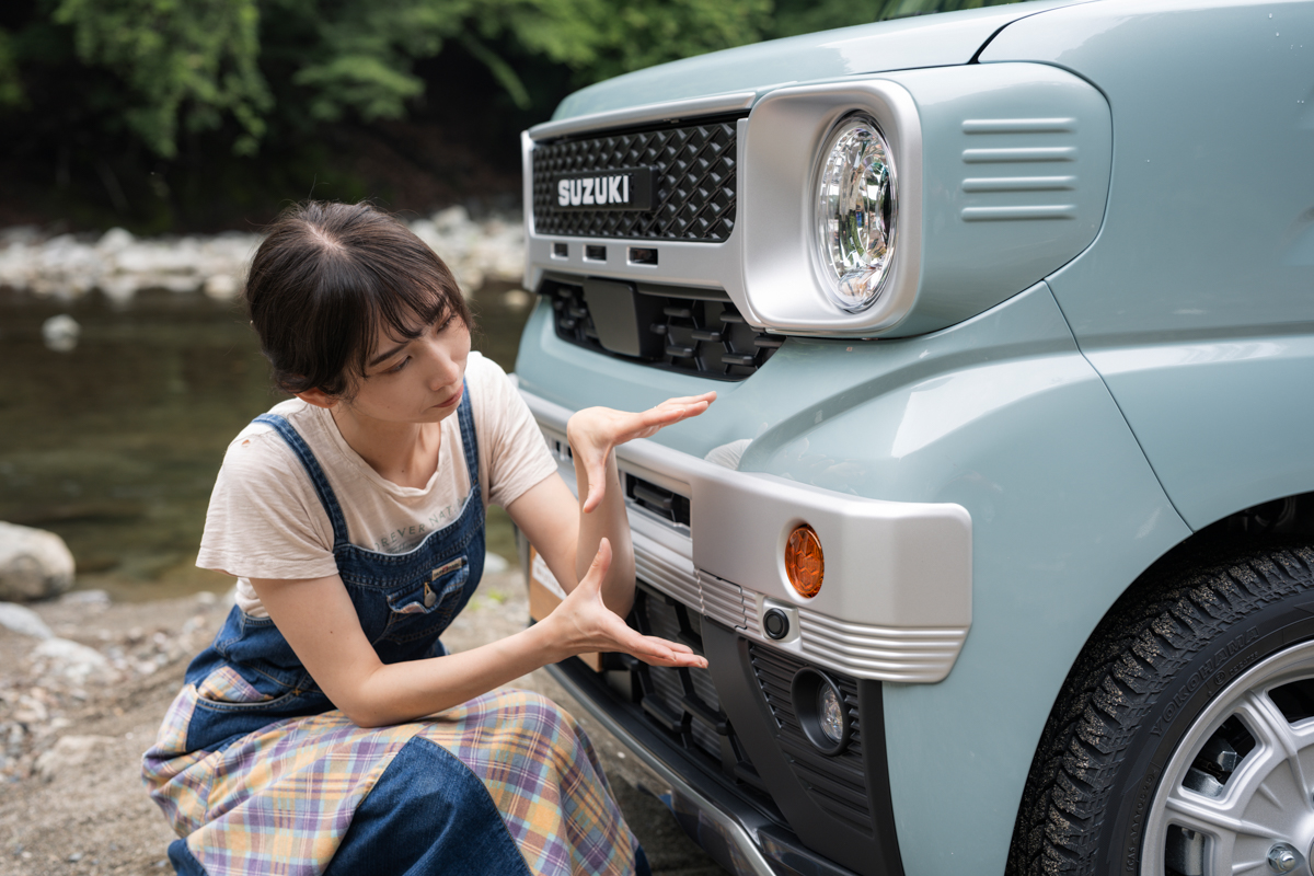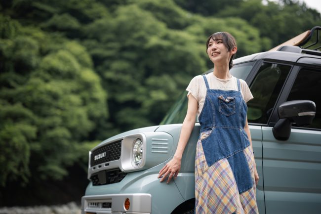 本記事で紹介する「スペーシアギア ノクト」のデモカーと、今回デイキャンプにでかけた森 風美さん