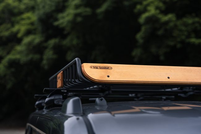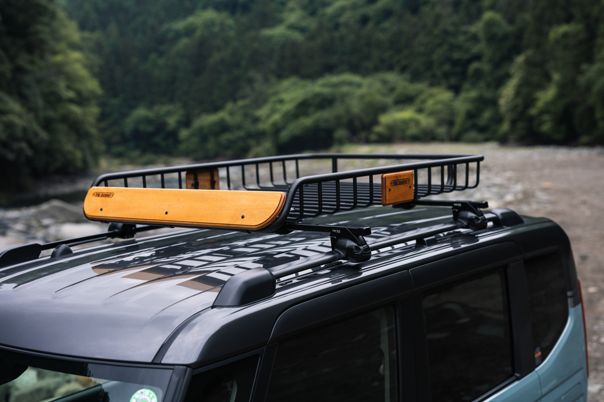 デモカーには「スペーシアギア ノクト」フェイスチェンジキットのほか「trip basketルーフラック」を装着。ルーフラックを装着することで、一気に“アウトドア感”が漂う仕上がりになる