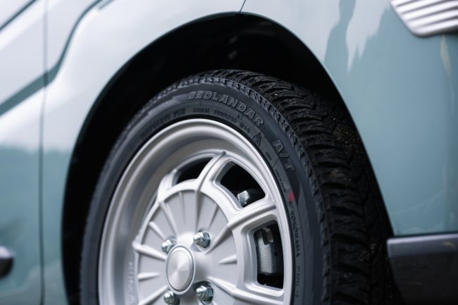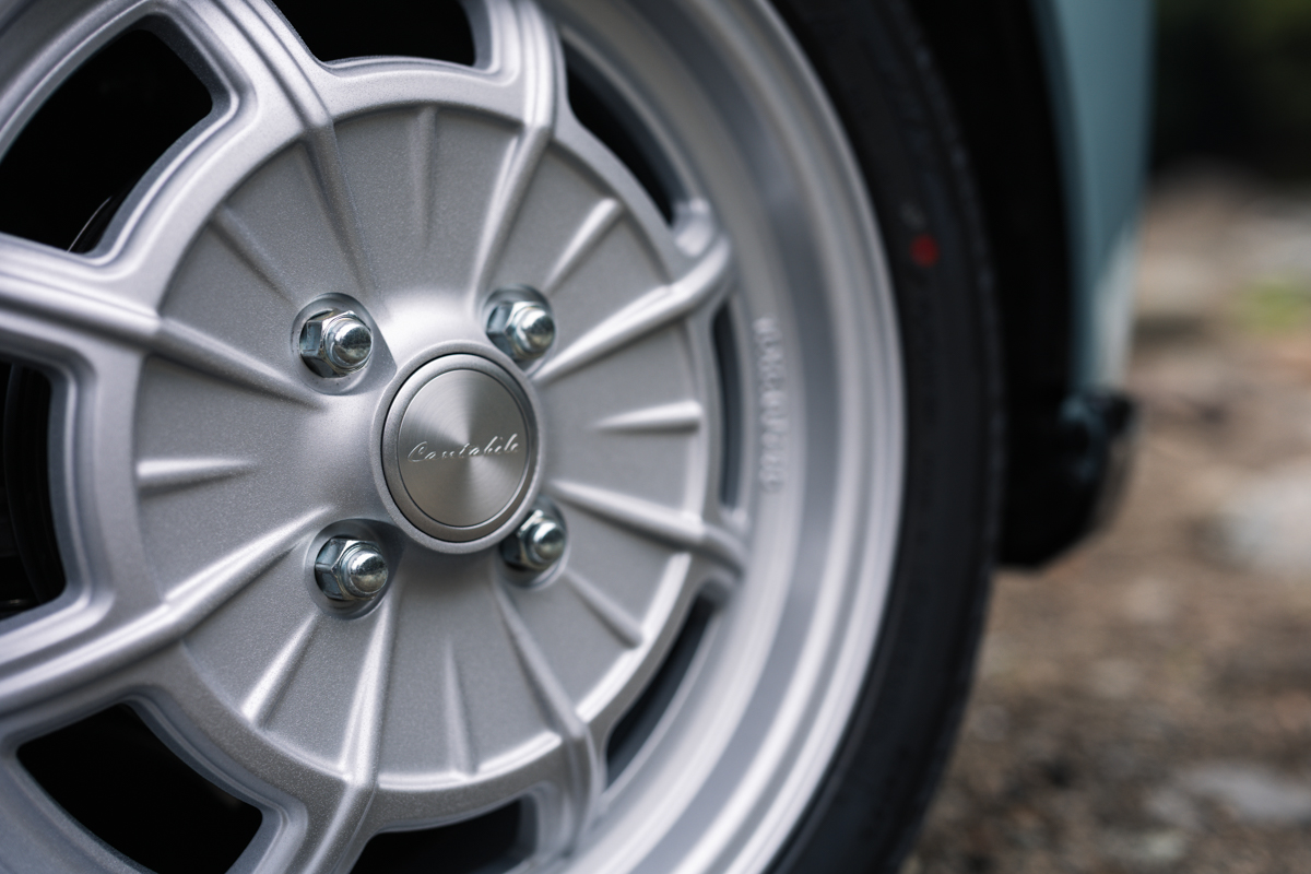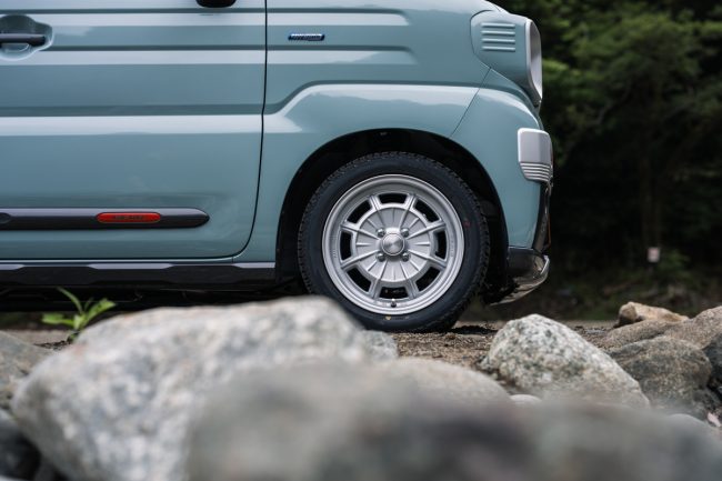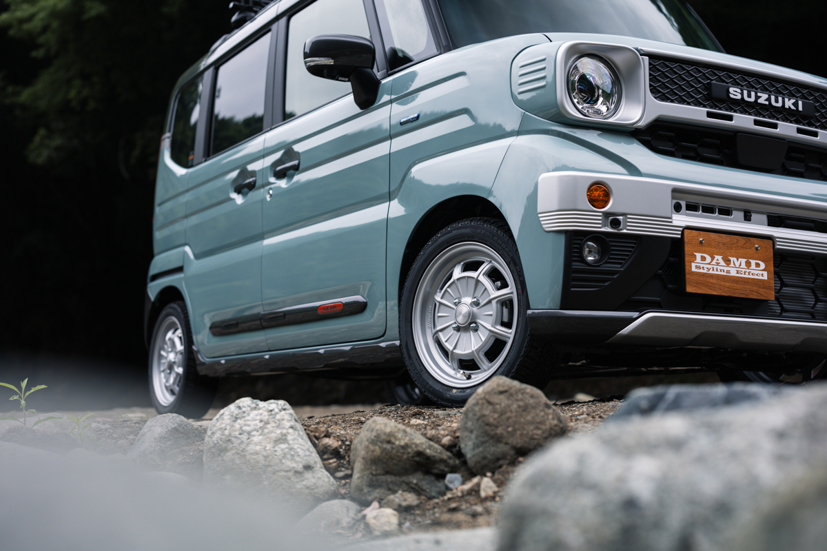 デモカーに装着しているダムドオリジナルホイール「カンタービレ」のサイズは15×5J+45(4-100)。ヨコハマタイヤのジオランダーA/Tを組み合わせ、アグレッシブな印象を与える
