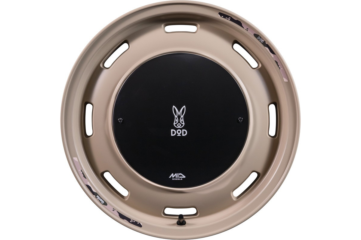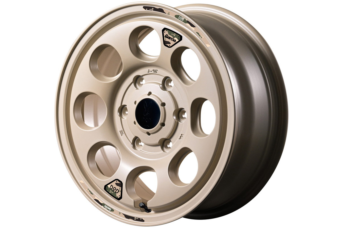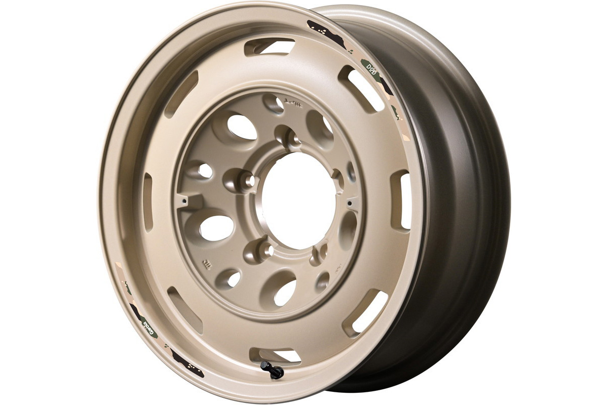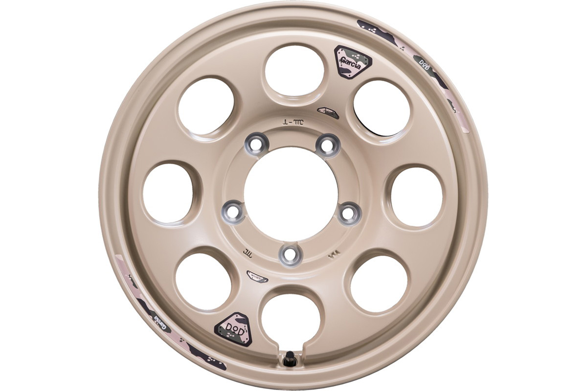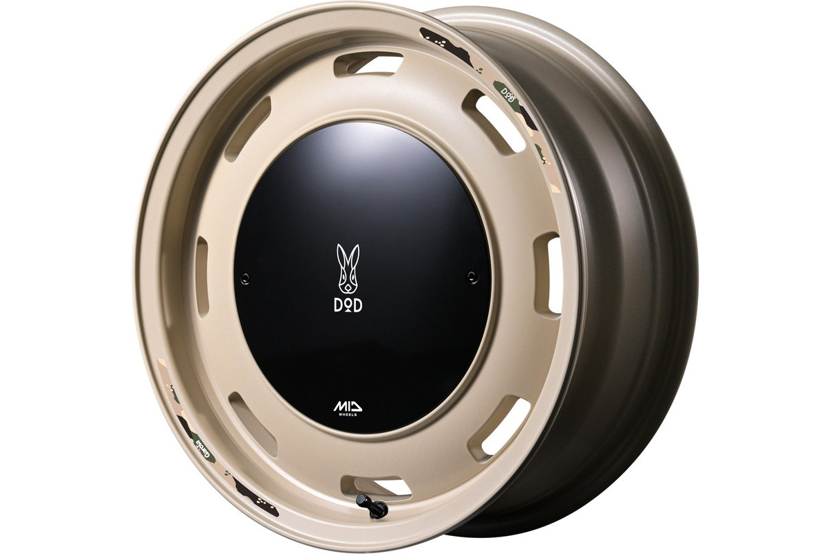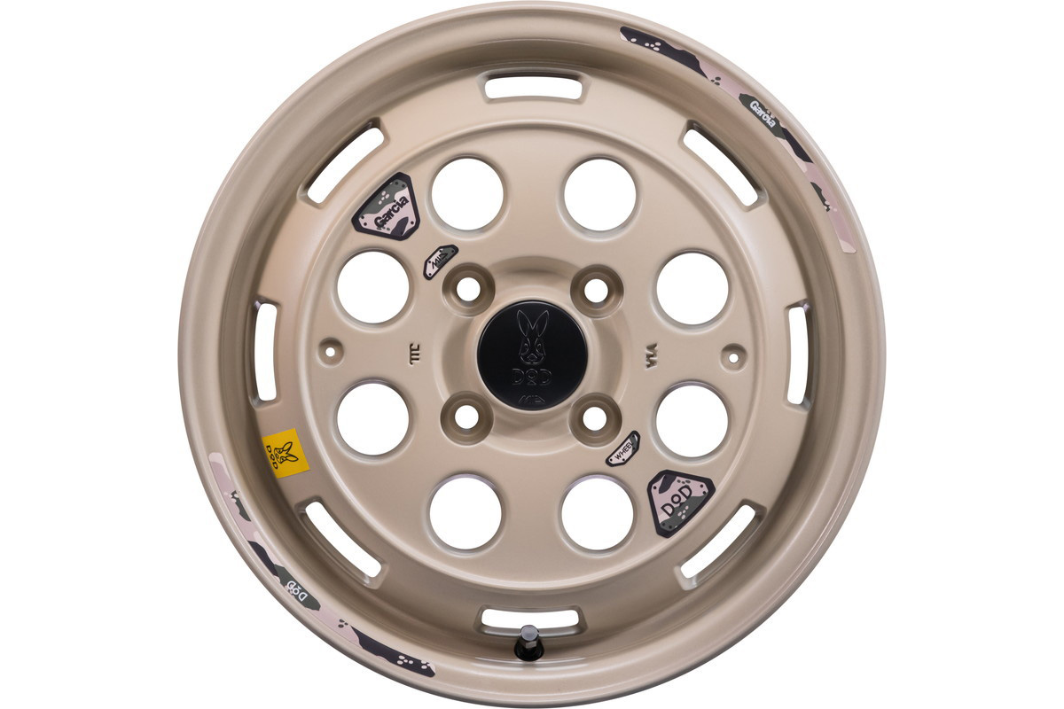「ウシャリン」16インチ6.5J+38。色はセミグロスサンドベージュ。センターキャップにはDODのロゴが入っている