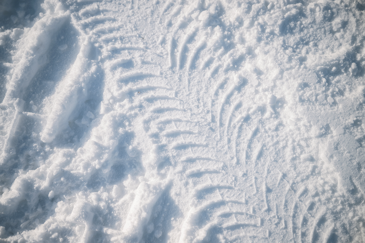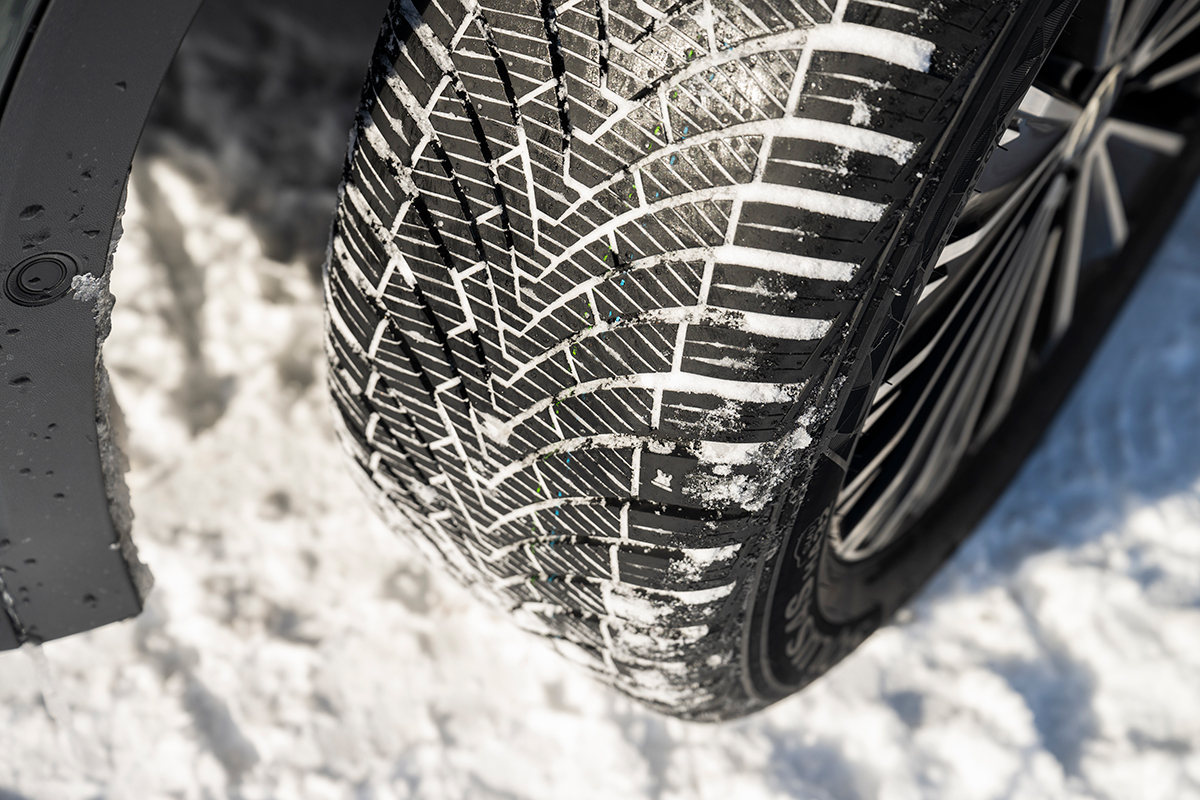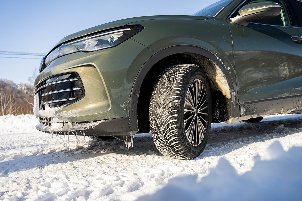 剛性の高さが、雪道でも正確なステアリング操作を可能に。独特のトレッドパターンが路面を捉え雪上でも安心して曲がれる
