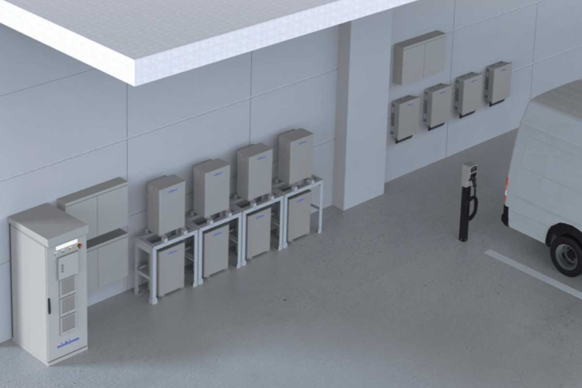 ニチコンは「BSシリーズ」という公共・産業用蓄電システムも手がけている。これはV2Xといわれるもので、Xはビルや商用電力などさまざまなものにつながることを意味する