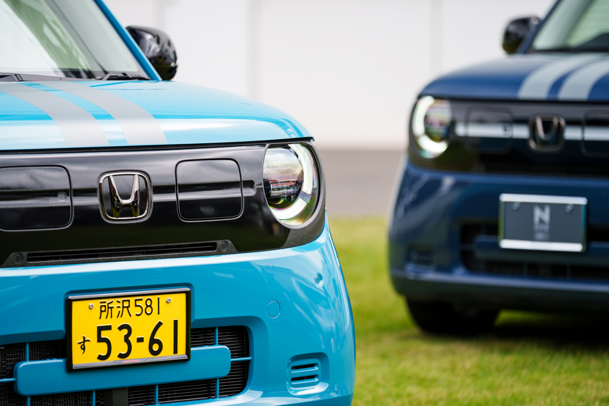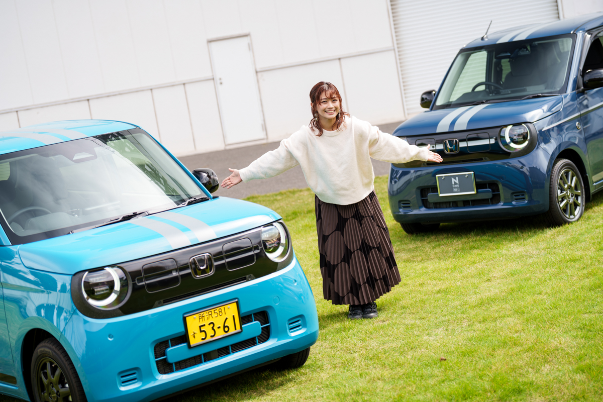 今回安枝瞳さん(愛称は「やっさん」)がチェックした「N-ONE e:」は、急速充電機能が標準装備の「e:G」グレード。左/純正アクセサリー装着車「SPORTY STYLE」(チアフルグリーン)、右/純正アクセサリー装着車「PREMIUM STYLE」(シーベッドブルー・パール)