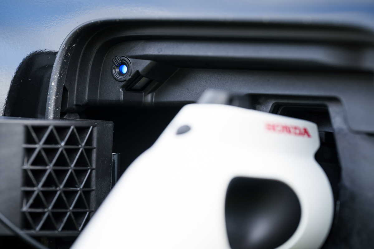 コンセントを接続した「AC外部給電器(Honda Power Supply Connector)」を普通充電ポートに差し込み、手もとのスイッチを2回押す。ポート左上の青ランプが光れば、給電された合図だ