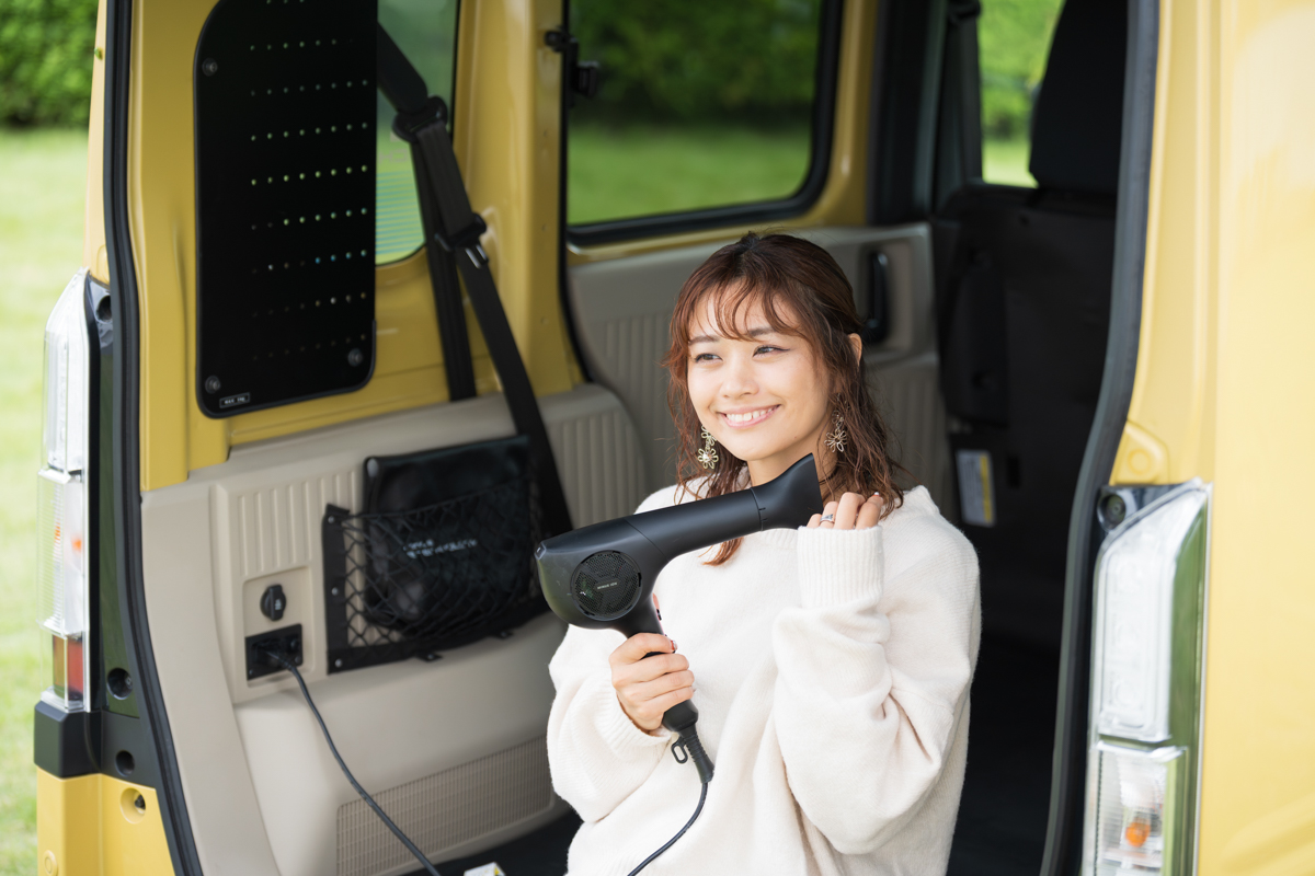 車内でAC100Vコンセントが使用可能! 最大1500Wまで使用できるので、車内でドライヤーを使用することも可能だ