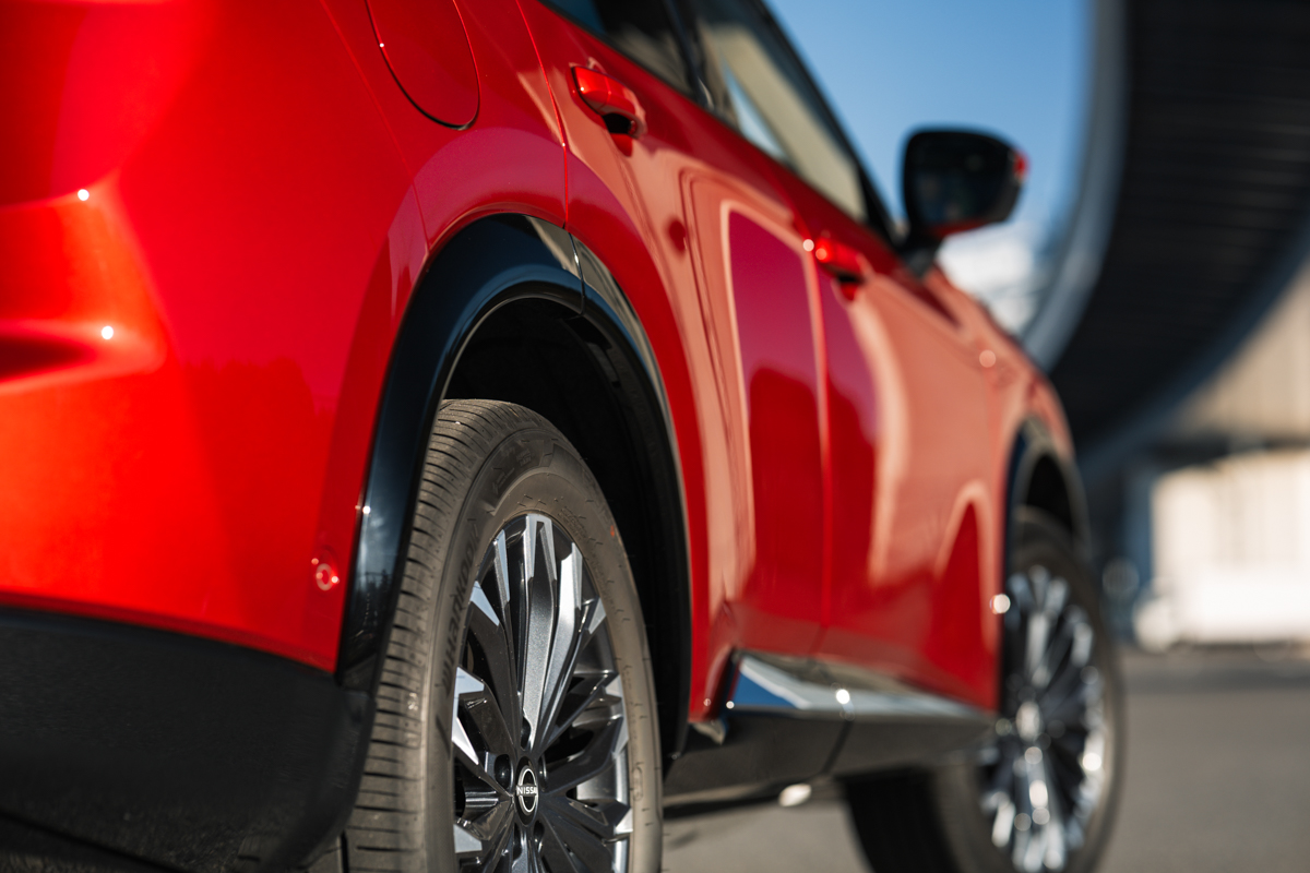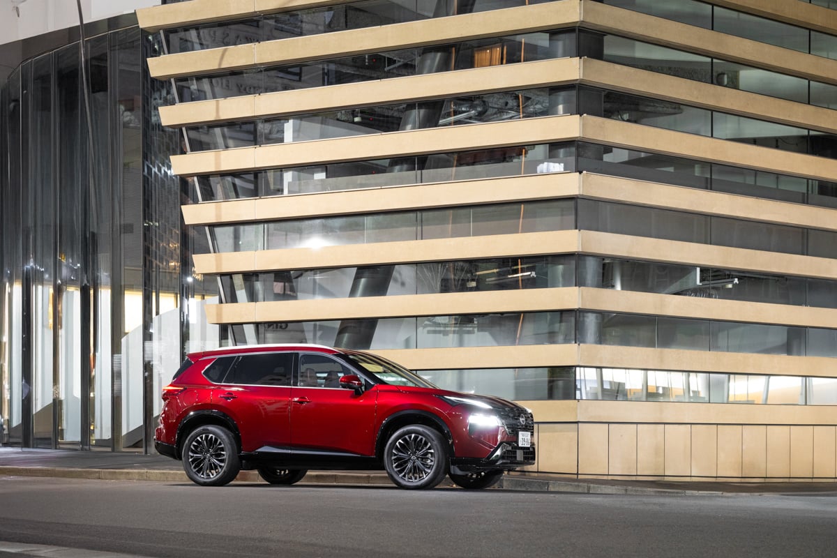 今回フォーカスする「エクストレイル」は、2025年8月にマイナーチェンジを実施。アウトドアシーンのみならず、夜の街並みにも似合う“大人のSUV”だ(画像のグレードは「G」e-4ORCE・カーディナルレッド)