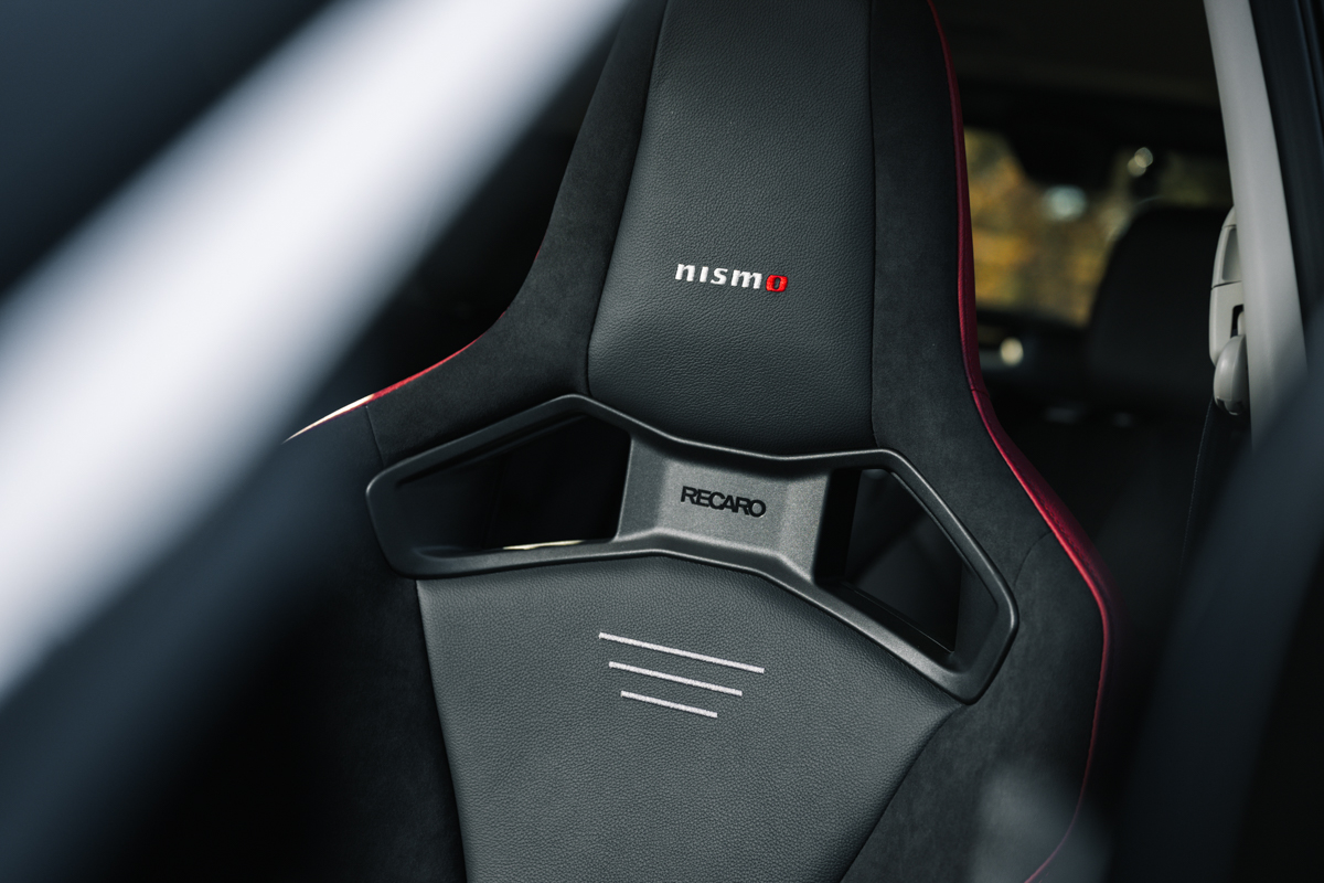 メーカーオプションとして用意されるNISMO専用チューニングのRECARO製スポーツシート。パワーリクライニング機構やシートヒーター機能も備え、スポーティでありながら、長く身を委ねたくなる快適性を兼ね備えている