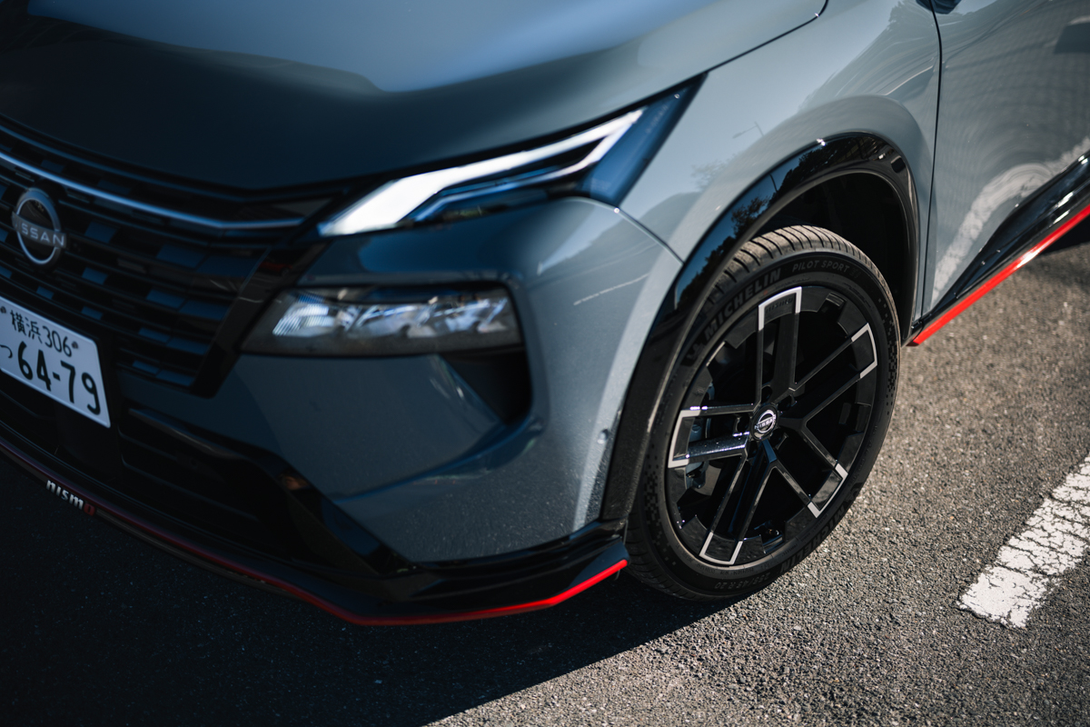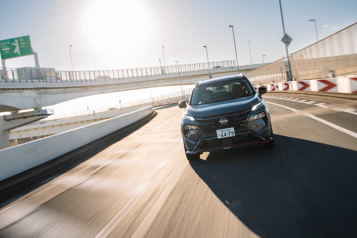 走行性能と乗り心地を両立するスウィングバルブを採用したカヤバ製ショックアブソーバーにミシュラン「PILOT SPORT EV」、専用アルミホイールを組み合わせたNISMO仕様。専用チューニングのパワーステアリングも相まって、走り出した瞬間からクルマとの対話が始まる。高速道路が楽しくて仕方がない