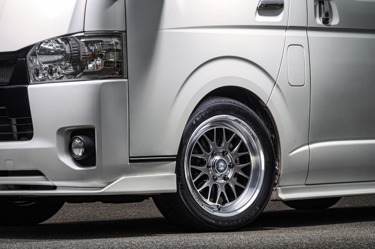 HOMURA 2x9L-RAを装着したトヨタ「ハイエース」。カラーはグレイスシルバー/リムDMC(QAJ)