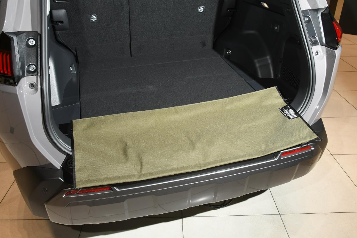 荷物の飛び出し防止以外に、デッキ部に敷くことで傷防止の役割を果たす「バックドアオープニングガード」(画像はバンパーガードとして使用した状態)