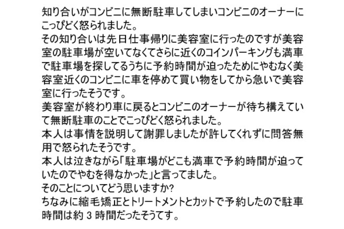 「知り合いがコンビニに無断駐車してしまい、オーナーにこっぴどく怒られました。こちらにも事情があったのですが、どう思いますか?」そんな質問が、大手質問投稿サイトに投稿され、話題を集めています。