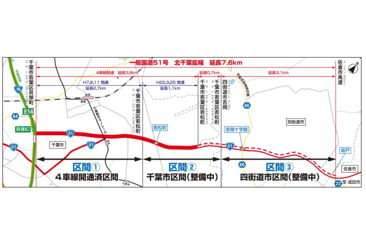 千葉~佐倉~成田をつなぐ重要幹線の「国道51号」で、混雑緩和のために「北千葉拡幅」事業が進められています。どう便利になり、工事はどこまで進んでいるのでしょうか。