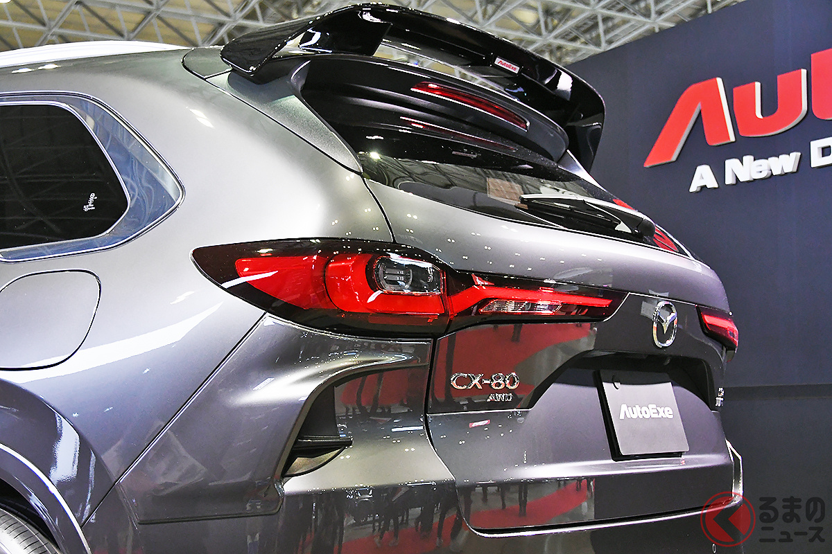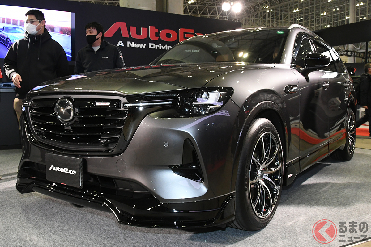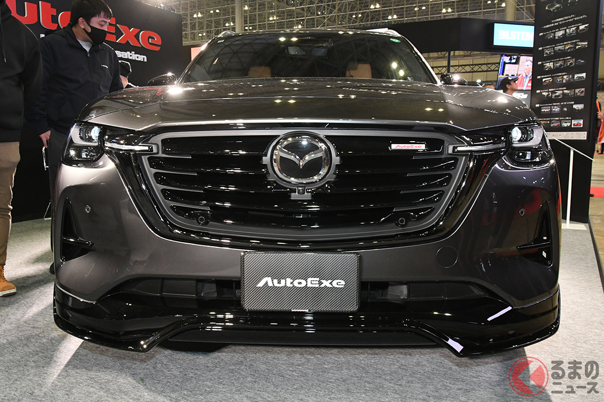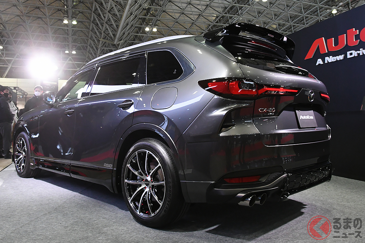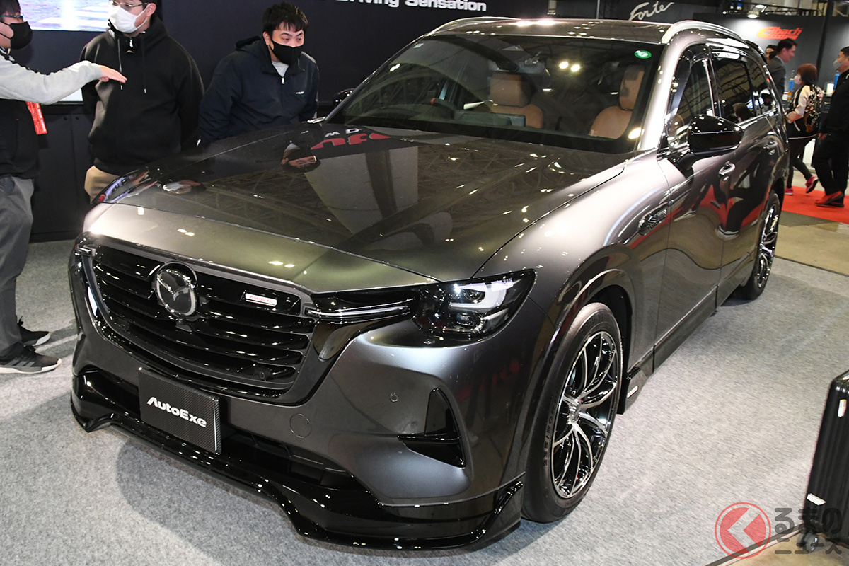 マツダ新「3列シートSUV“カスタム”」初公開! ローダウン×「重厚“黒”エアロ」で「CX-80」がグッと“精悍”に! オートエクゼ「KL-07」TASで実車展示