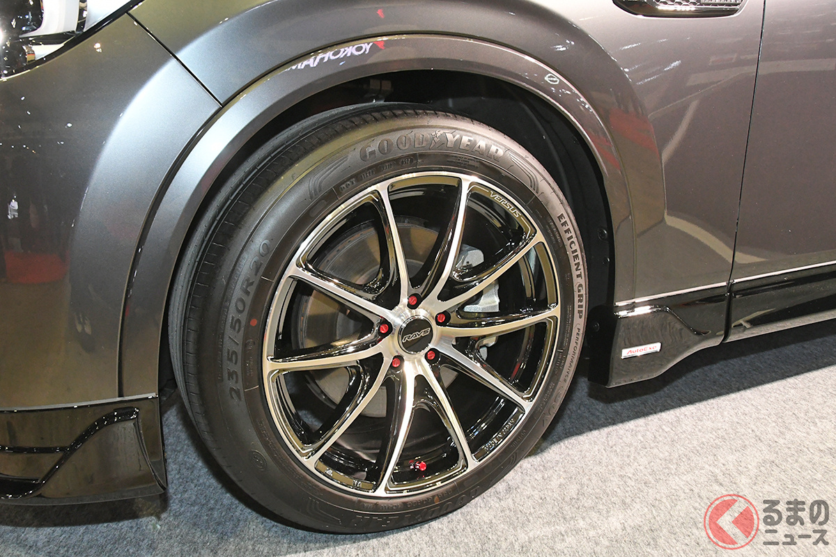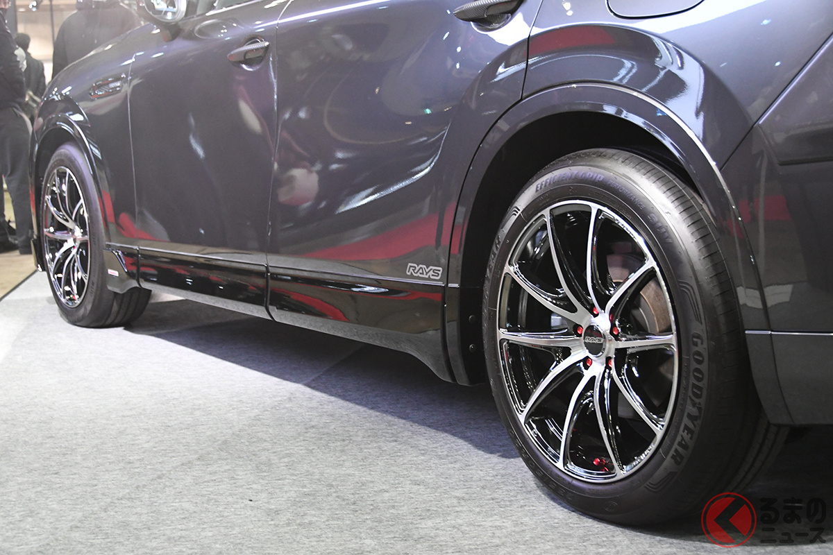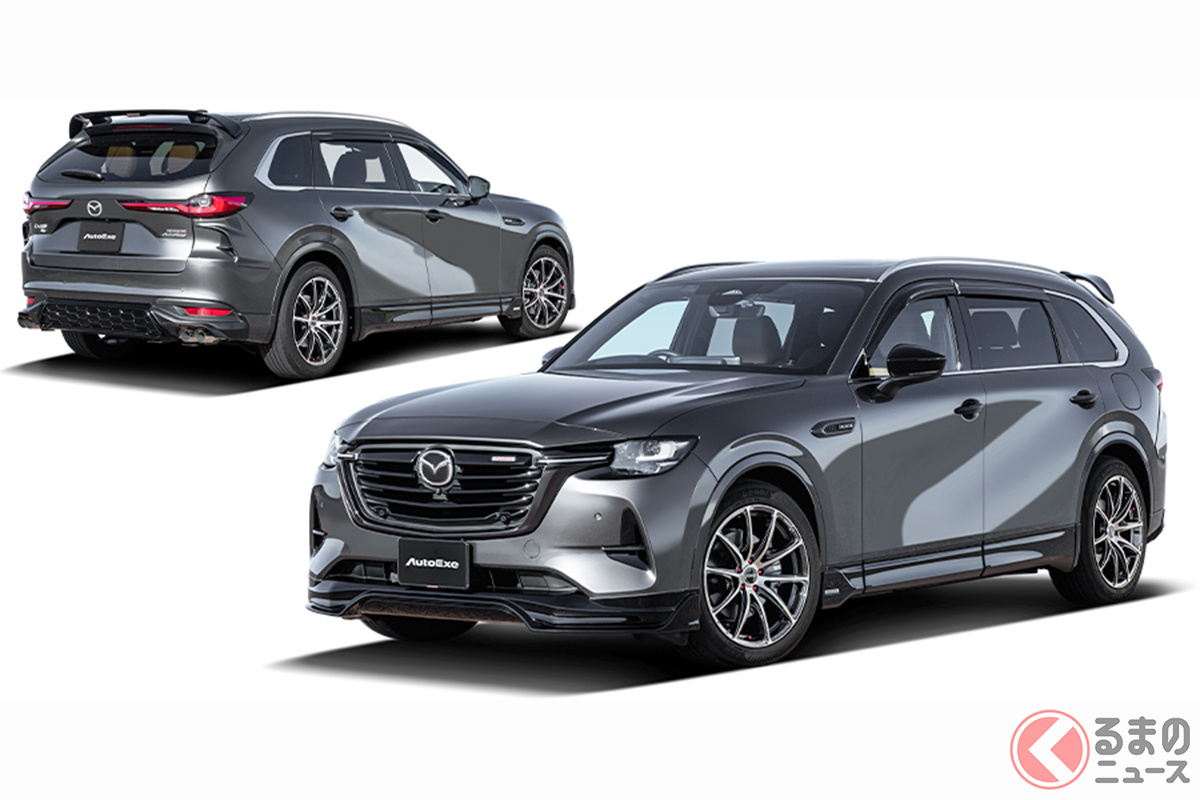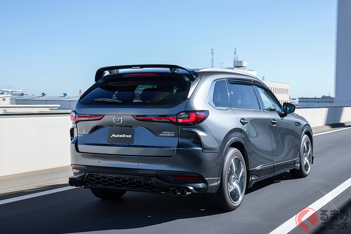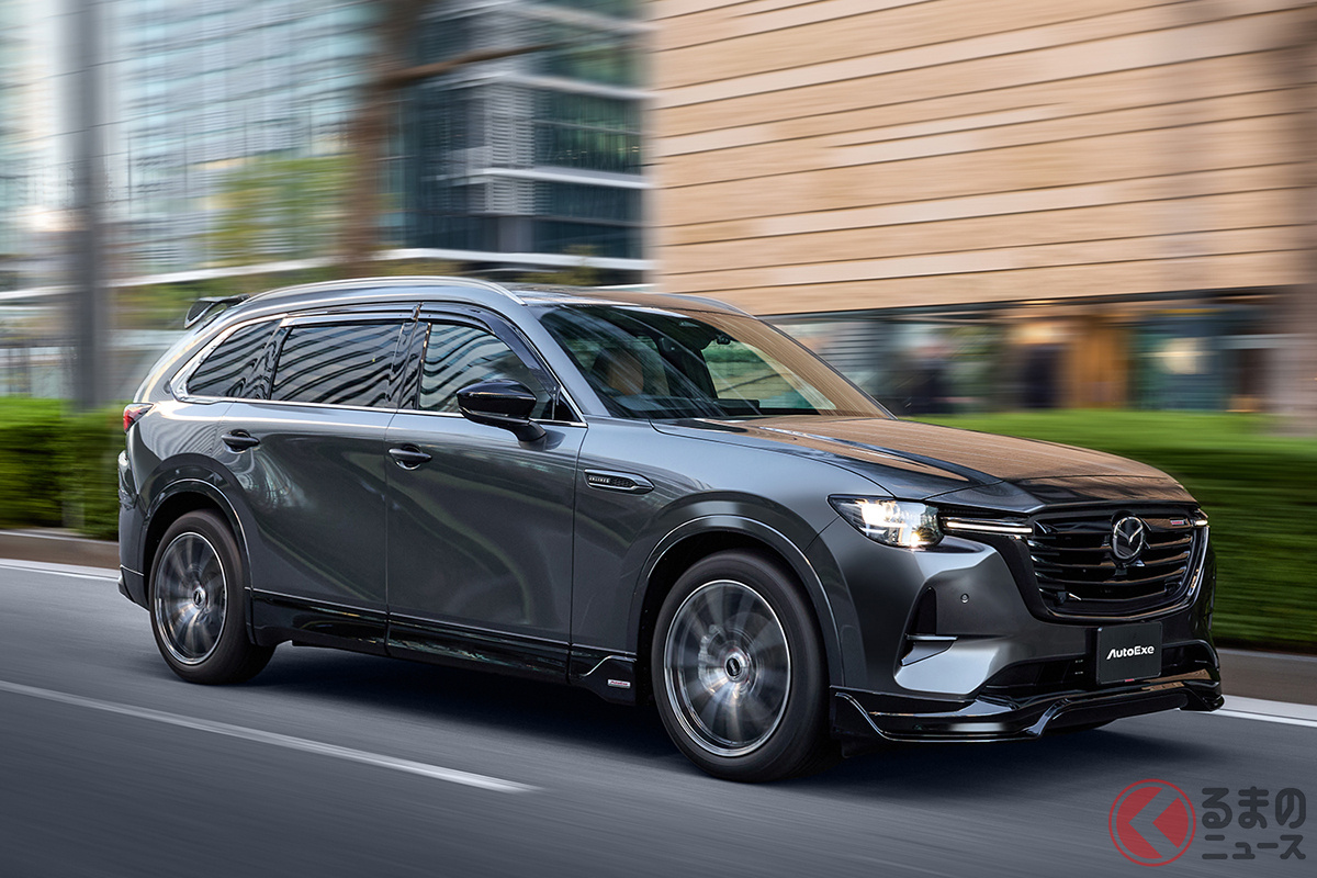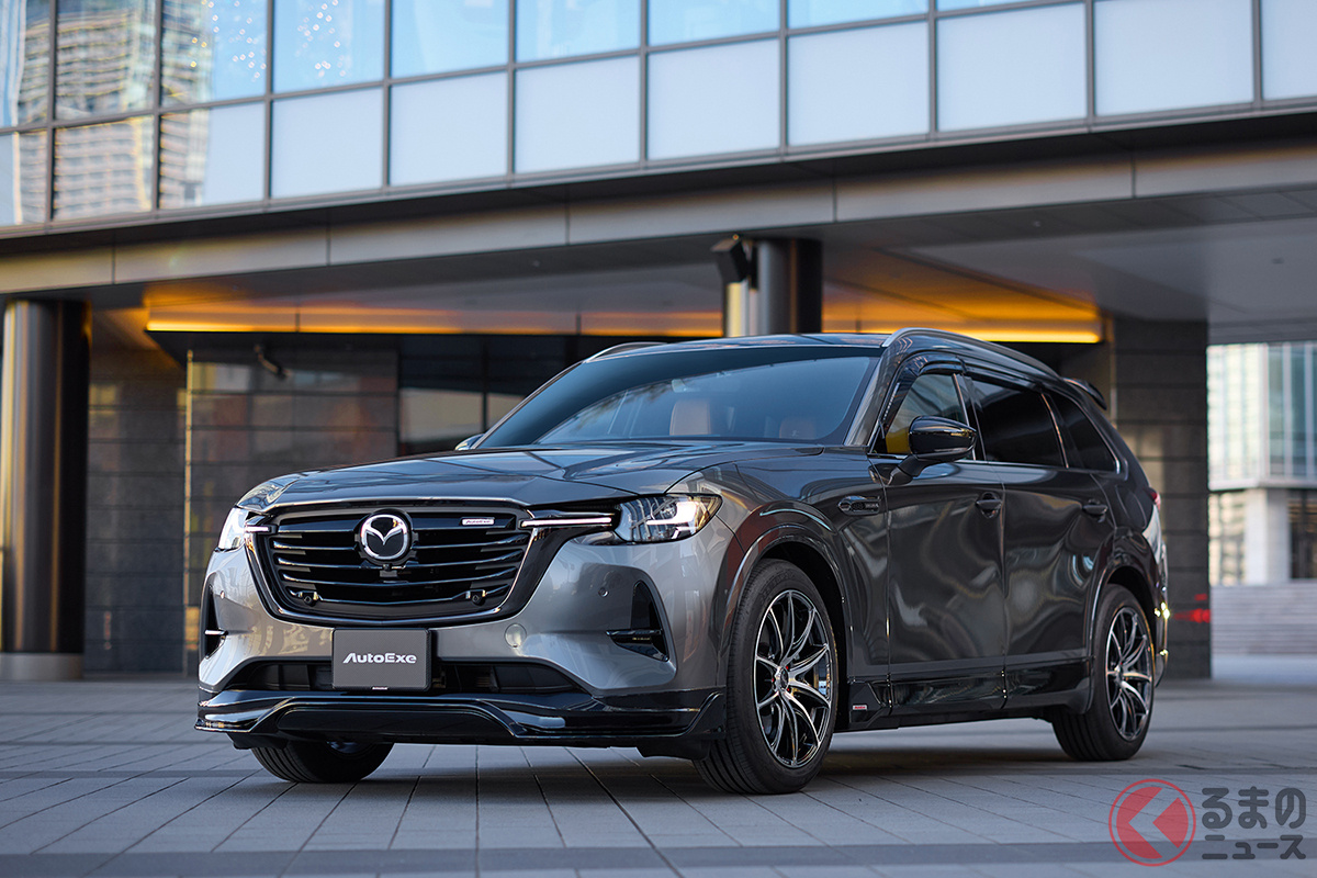マツダ新「3列シートSUV“カスタム”」初公開! ローダウン×「重厚“黒”エアロ」で「CX-80」がグッと“精悍”に! オートエクゼ「KL-07」TASで実車展示
