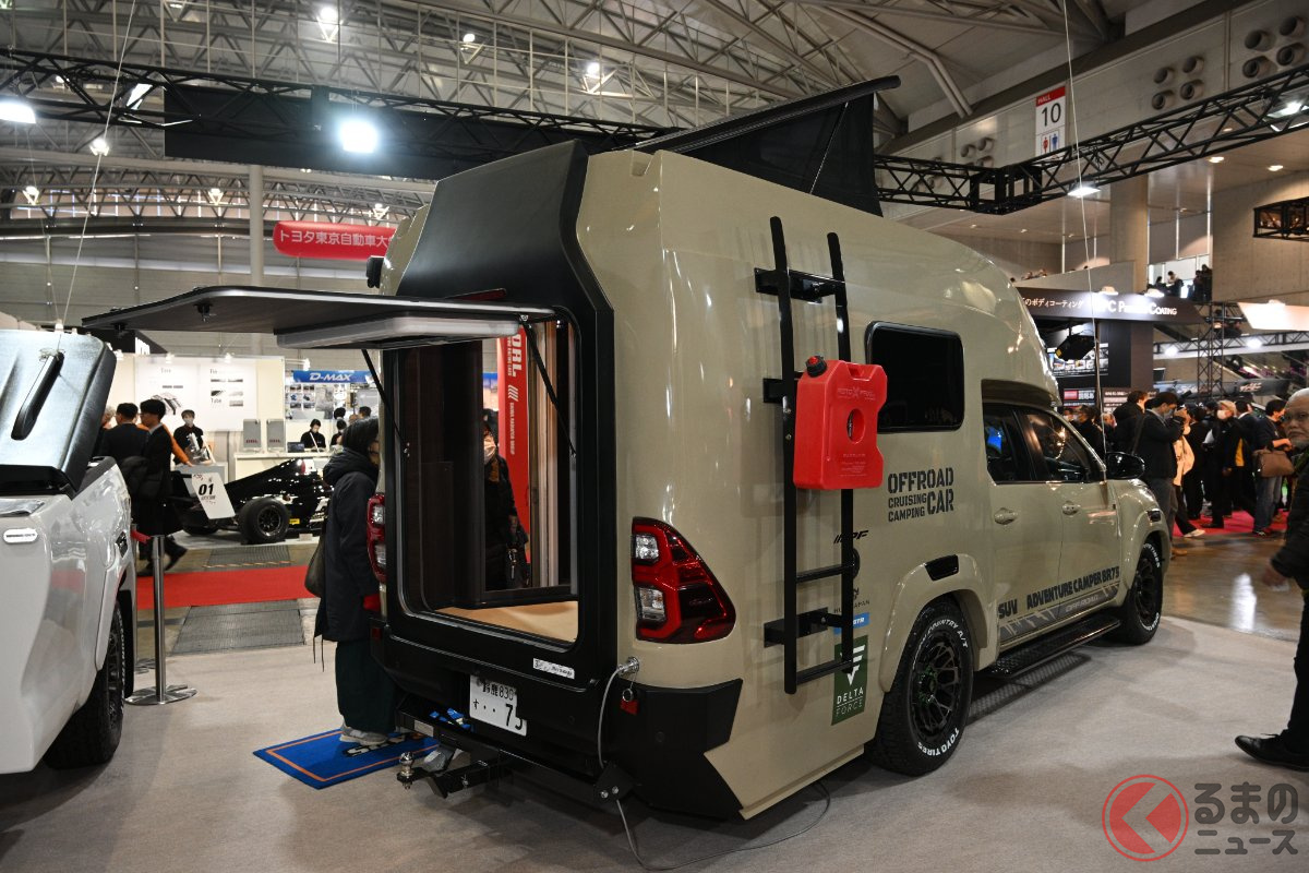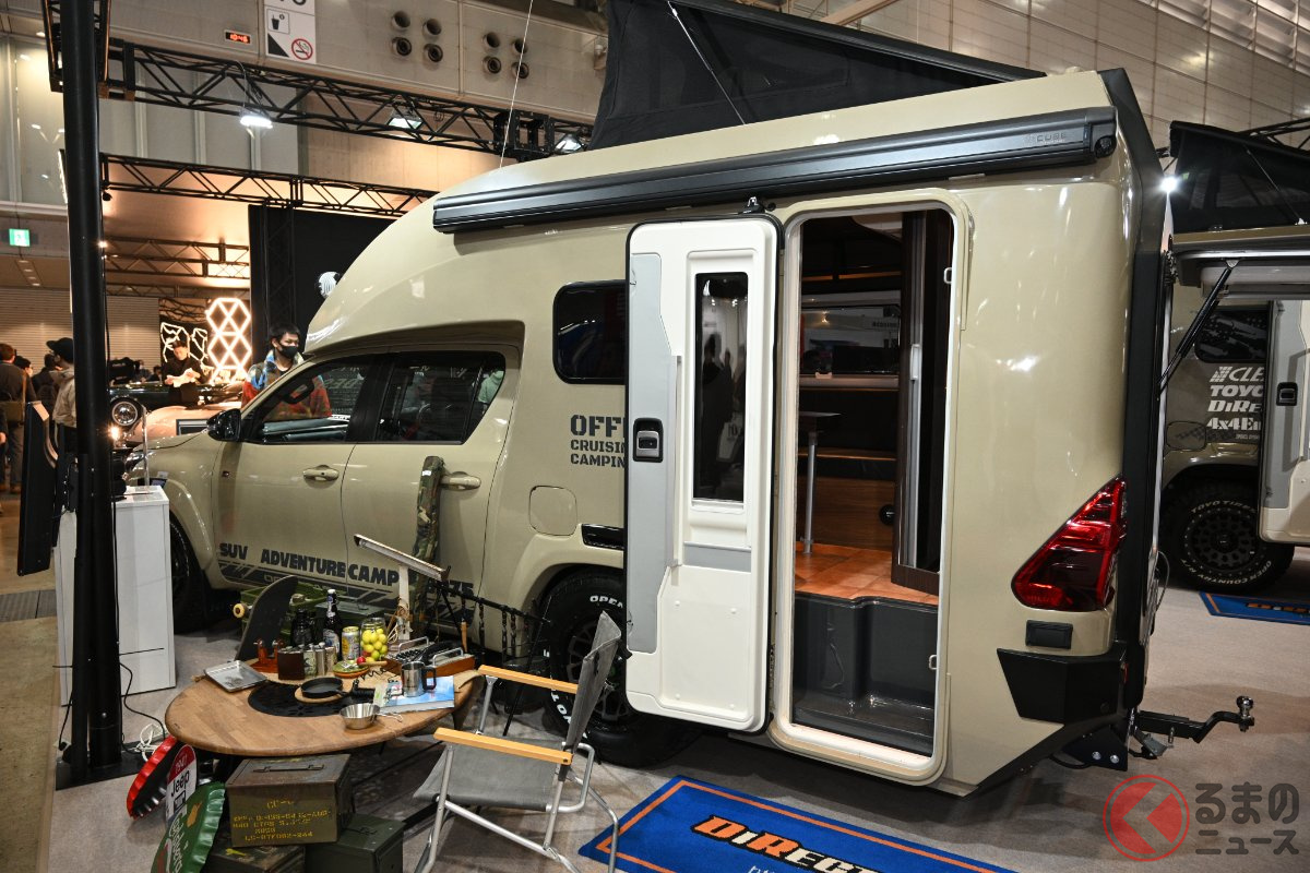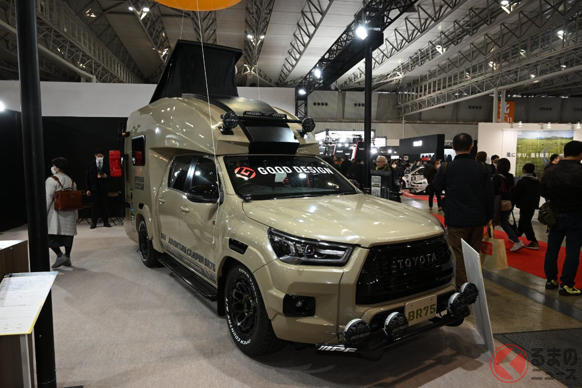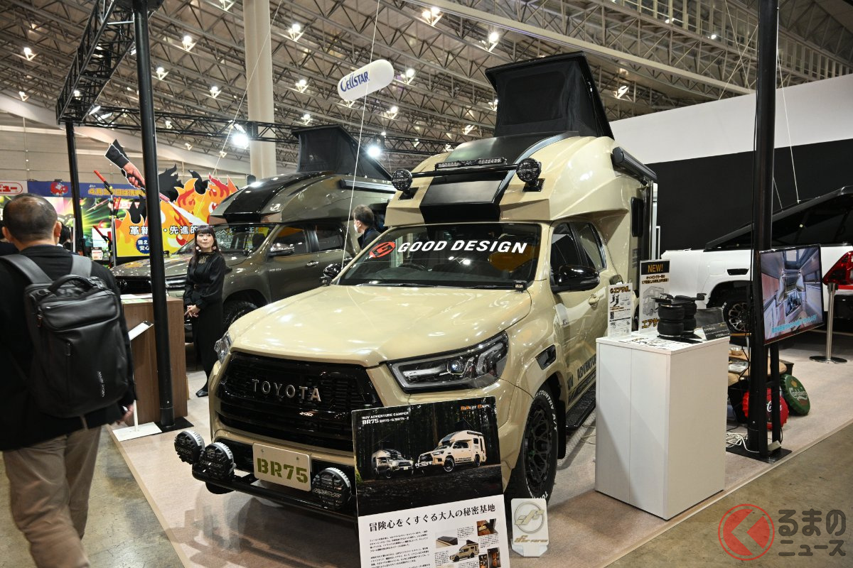 鮮烈な「ハイラックス“タフ車中泊仕様”」登場!? 立って歩ける専用設計の“めちゃ広い居住空間”がスゴい! シャワーも完備のダイレクトカーズ「BR75」TASで実車公開