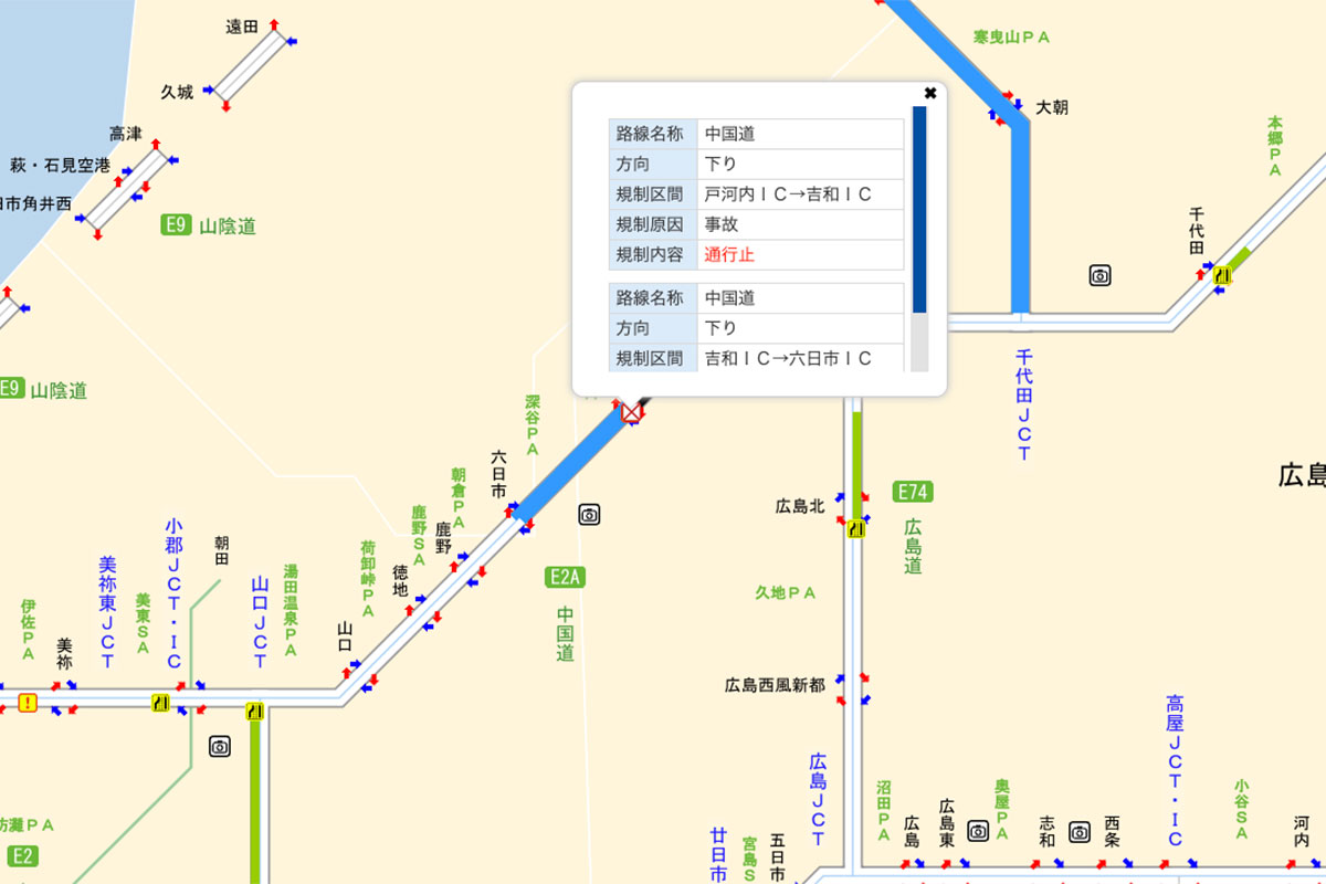 「事故発生!」 中国道が「一時通行止め!」 大阪方面の上り線で「人が倒れている」情報も 下り線は「工事現場崩落」発生し通行止めに 上下線2区間で迂回必要