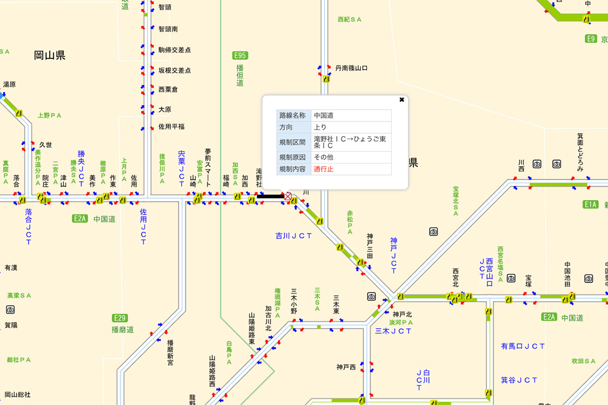NEXCOによると、2025年1月28日 10時50分現在、中国道上り線が 滝野社IC〜ひょうご東条IC間で通行止めとなっています。