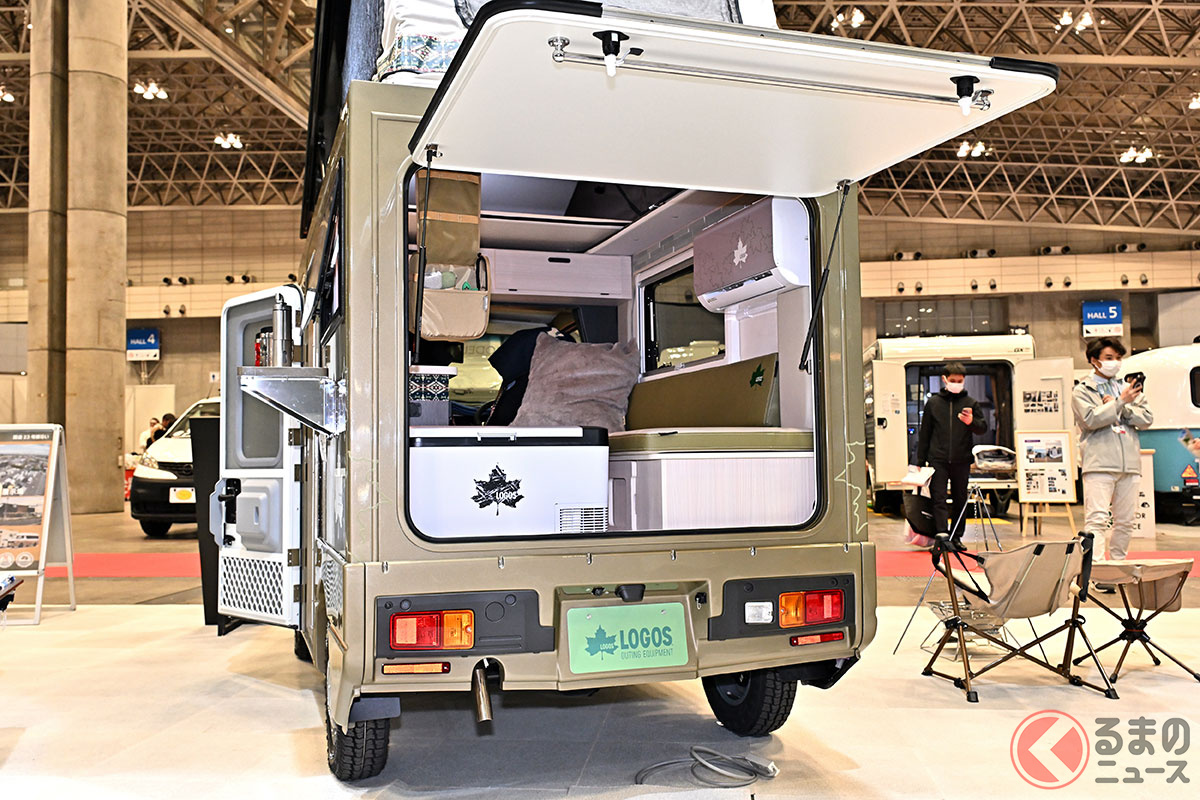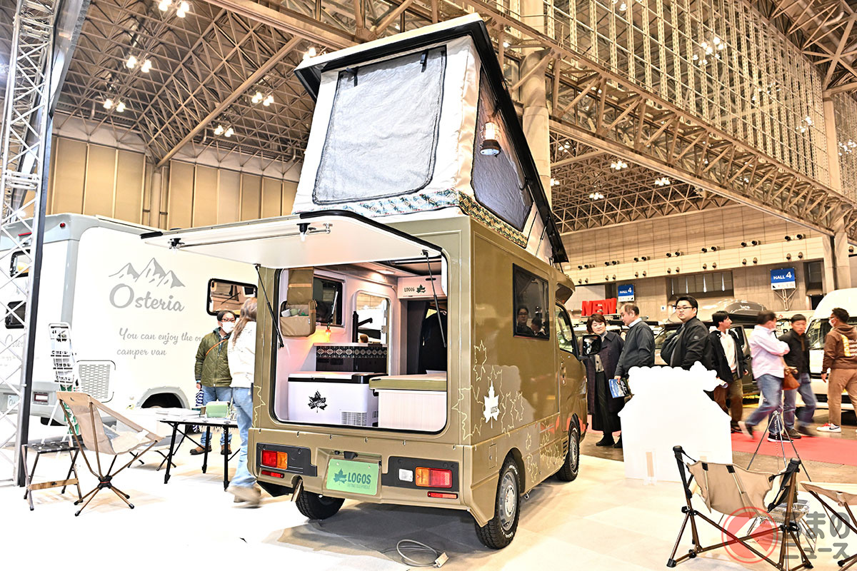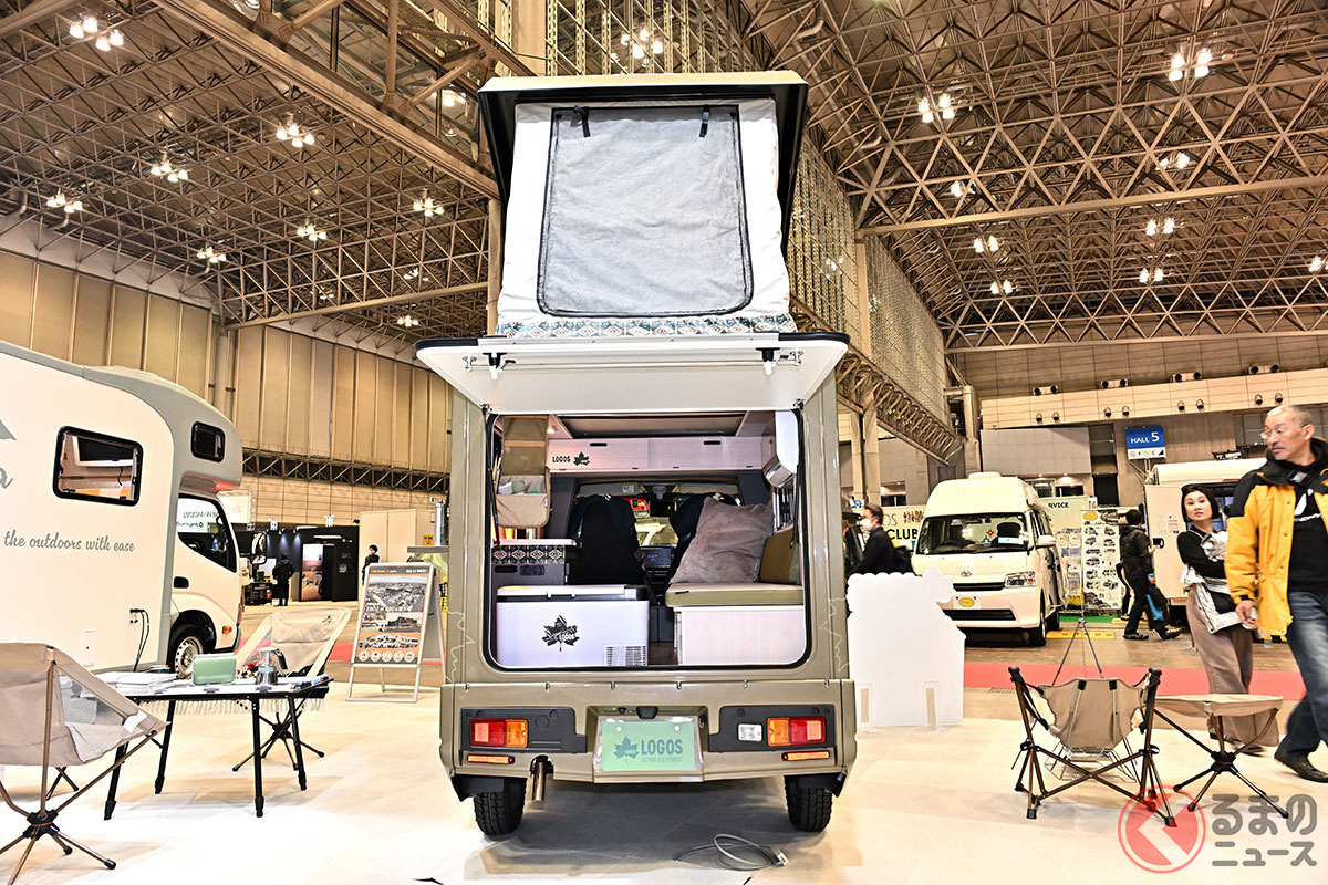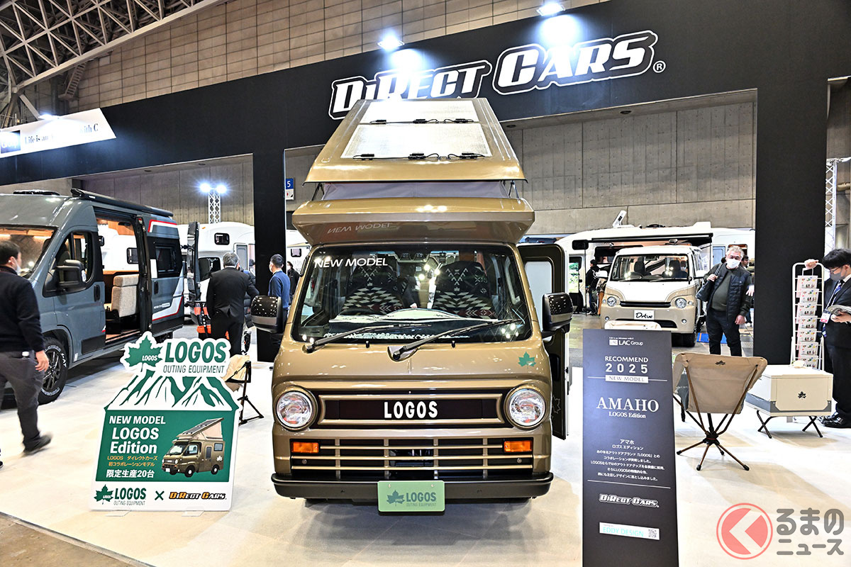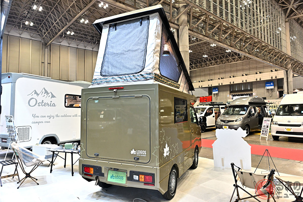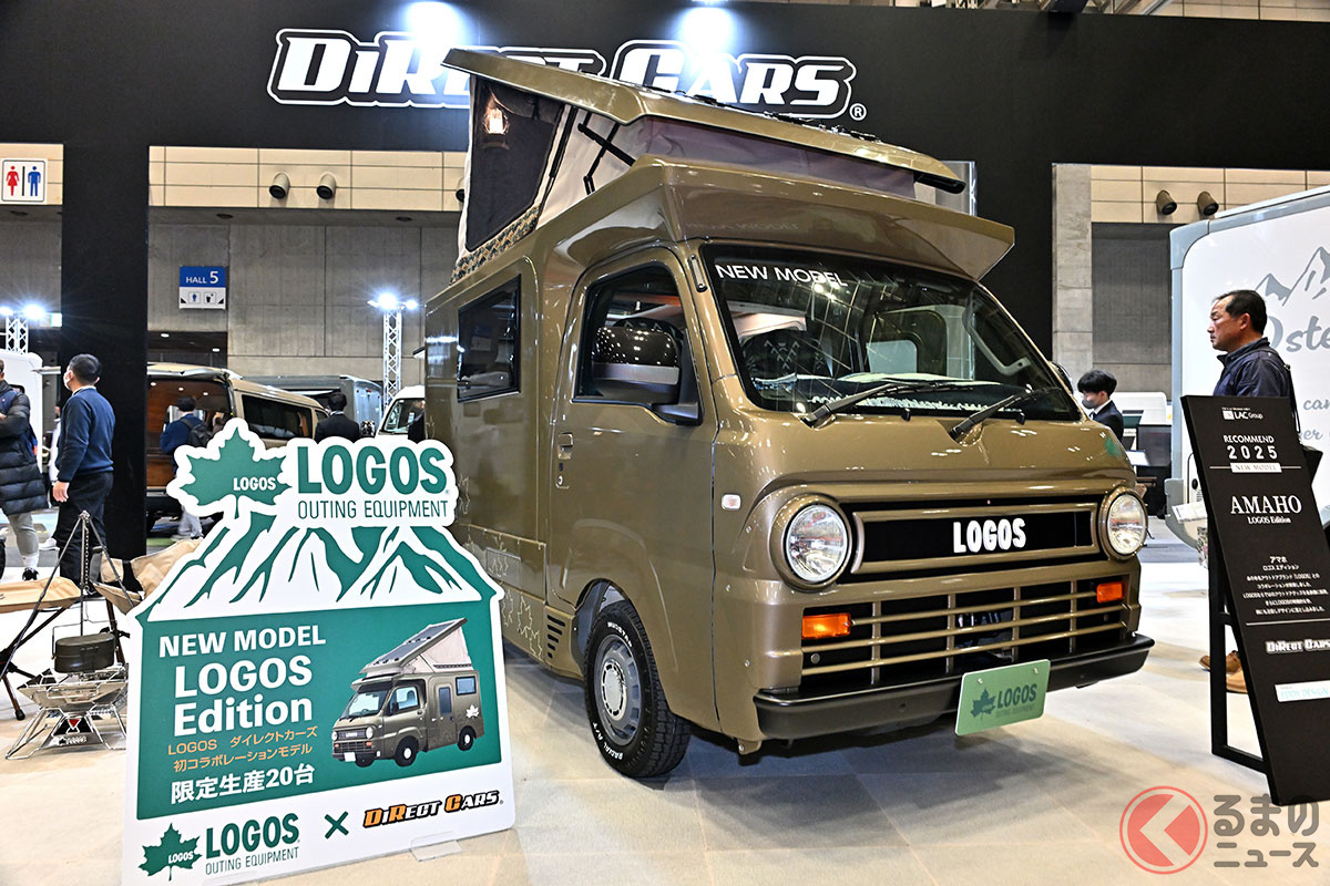 旧車デザインの新「4人乗り“軽トラ”」公開! 「“パカッ”とルーフ」で“車上泊”もできる! アウトドアブランドとコラボしたダイレクトカーズの軽キャンパー「アマホ ロゴス エディション」登場