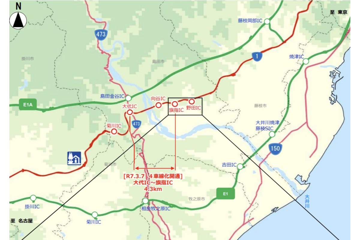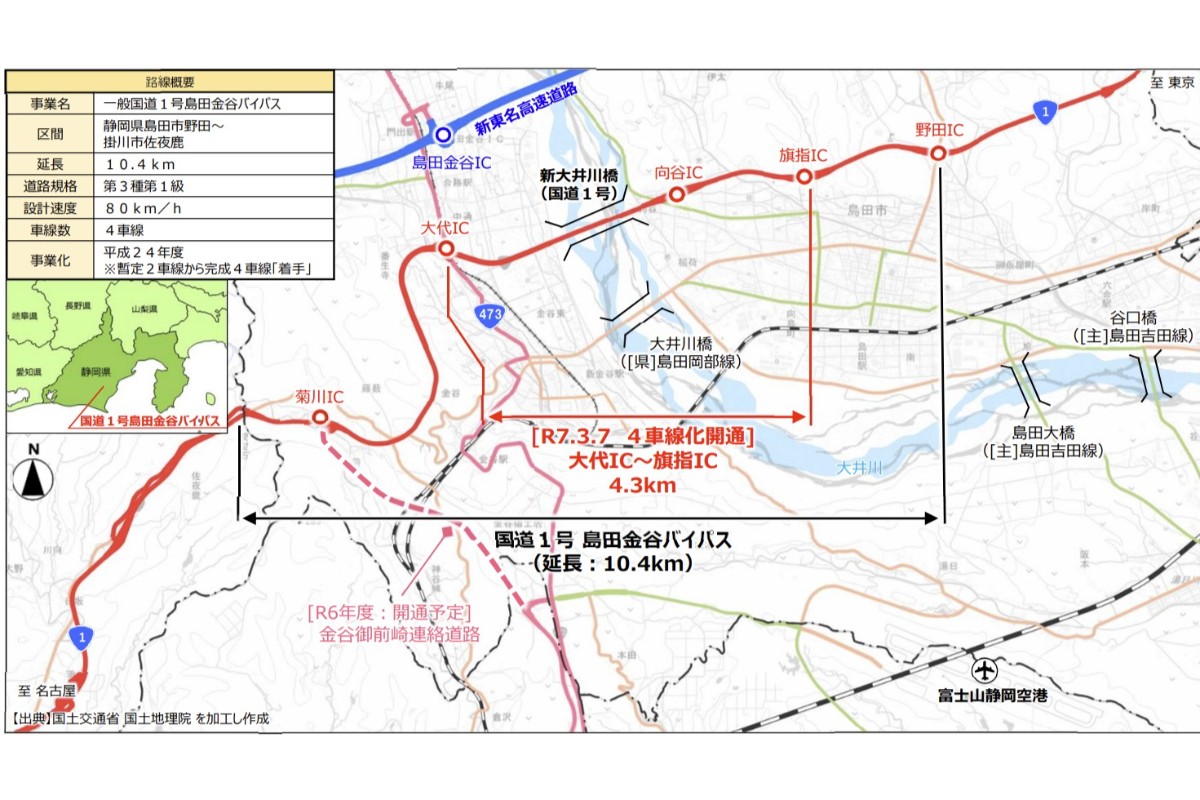静岡県の大井川を渡る国道1号「島田金谷バイパス」が2025年3月7日、念願の4車線化を果たしました。