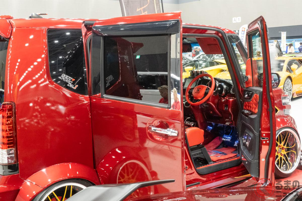 “BMW”顔の「軽」!? まさかの“観音開き”仕様な「N-BOX」公開! 鮮烈レッド内装も超カッコイイ「ドイツ風スーパーハイトワゴン」とは
