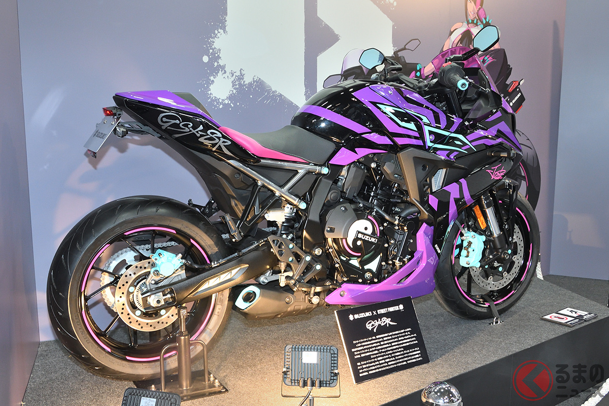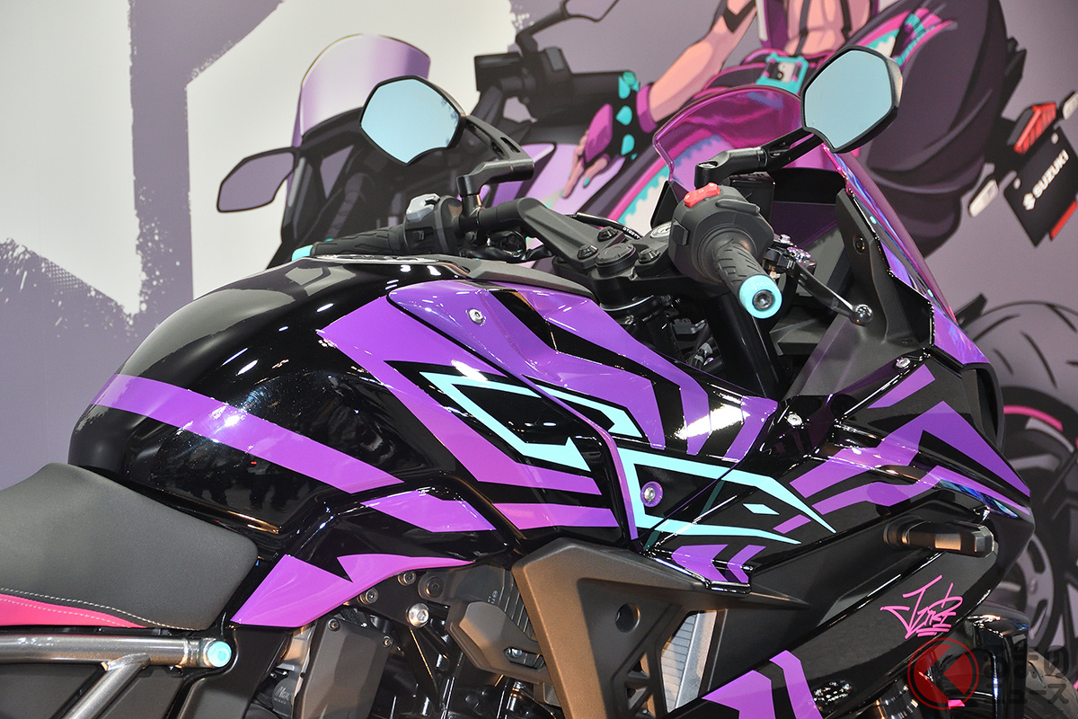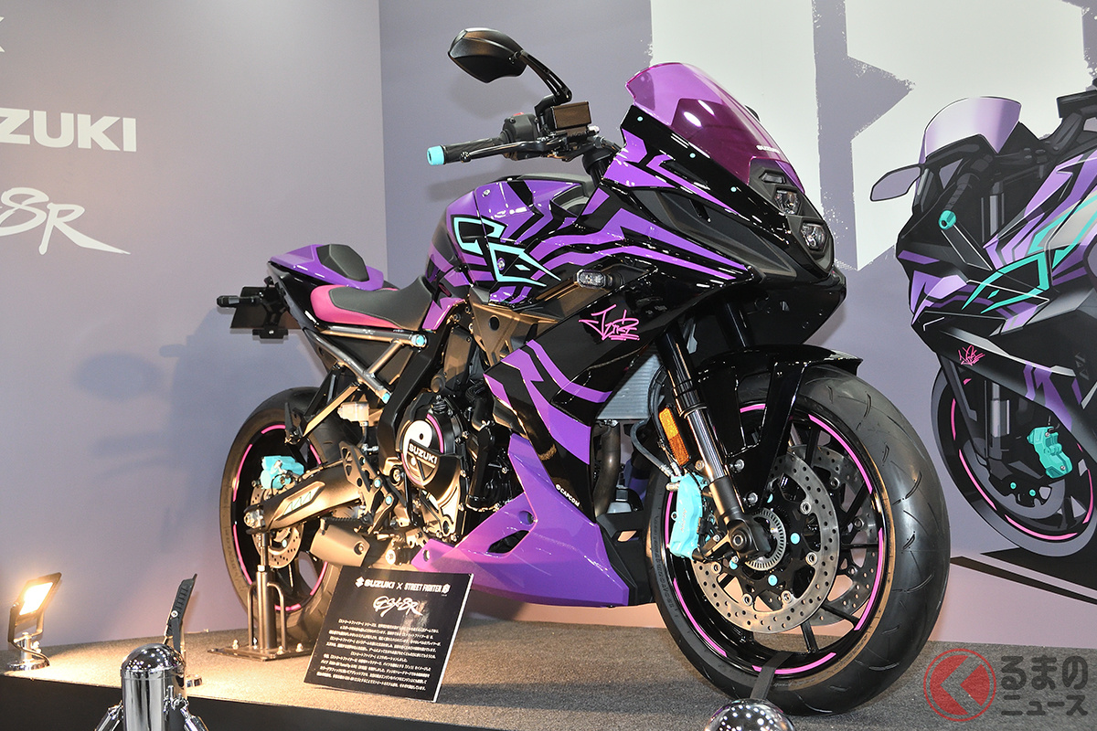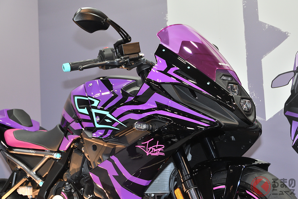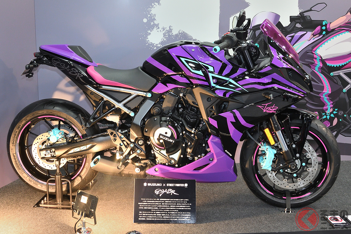 スズキの斬新「“スト6”コラボバイク」がスゴイ! 「ジュリ」イメージの“ド派手”グラフィック×「風水エンジン」採用! 「カッコよすぎ!」の声が集まる「GSX-8R Tuned by JURI」実車展示
