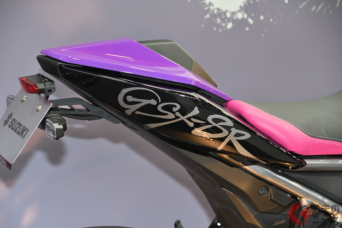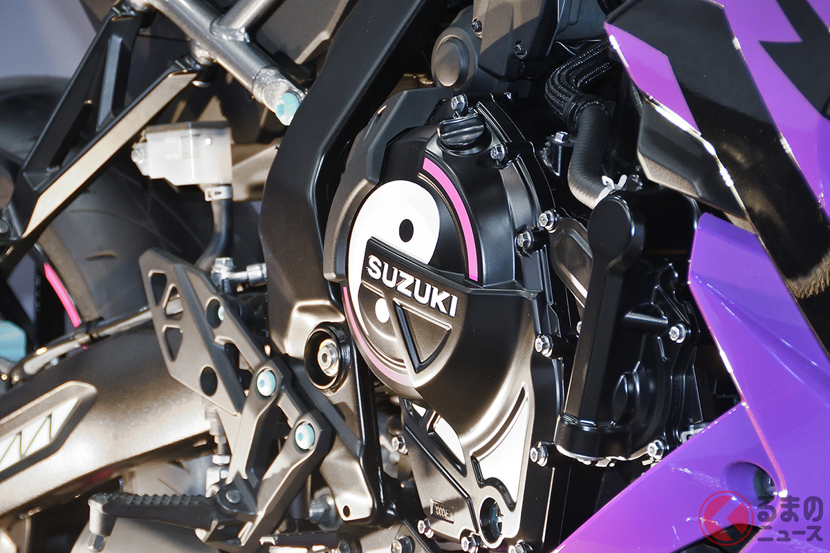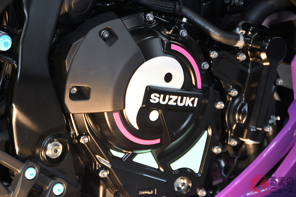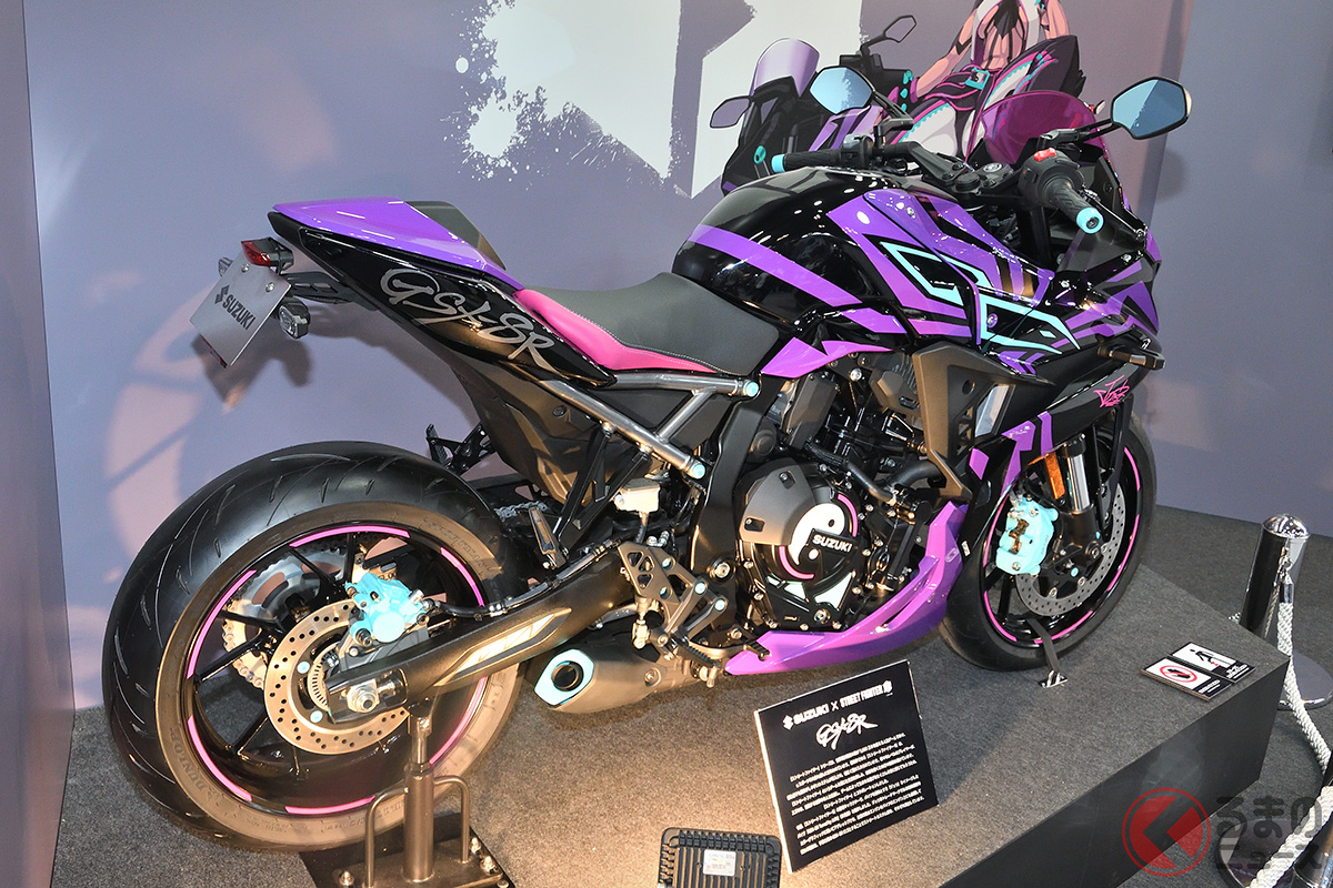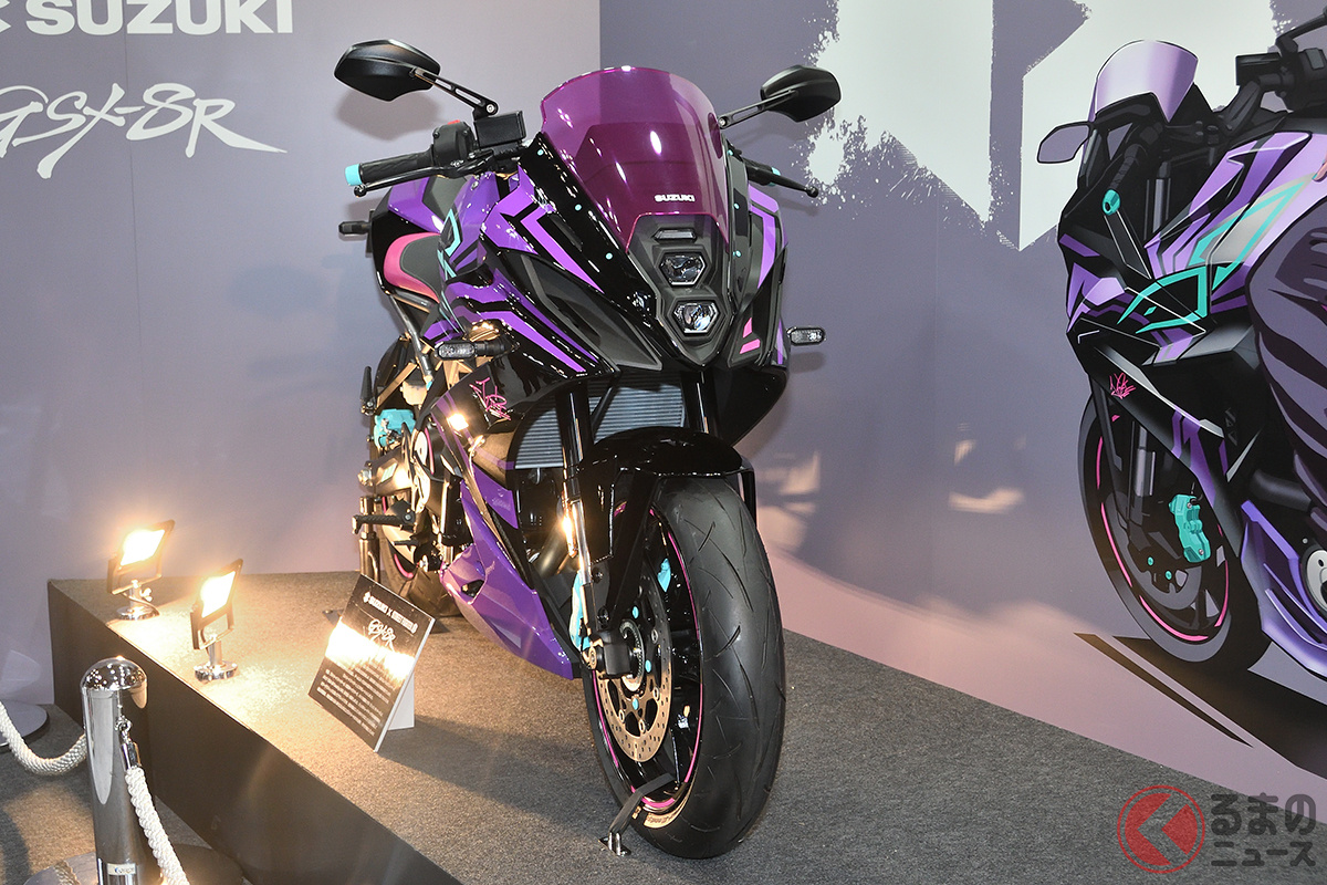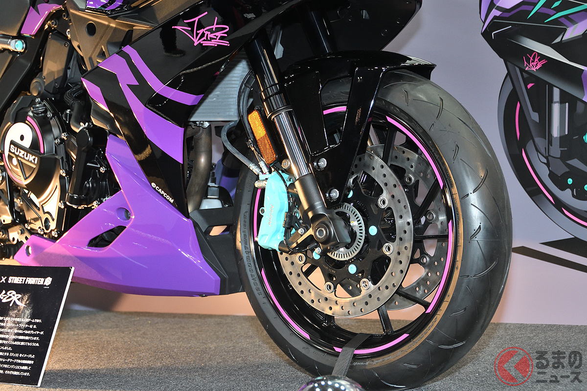 スズキの斬新「“スト6”コラボバイク」がスゴイ! 「ジュリ」イメージの“ド派手”グラフィック×「風水エンジン」採用! 「カッコよすぎ!」の声が集まる「GSX-8R Tuned by JURI」実車展示
